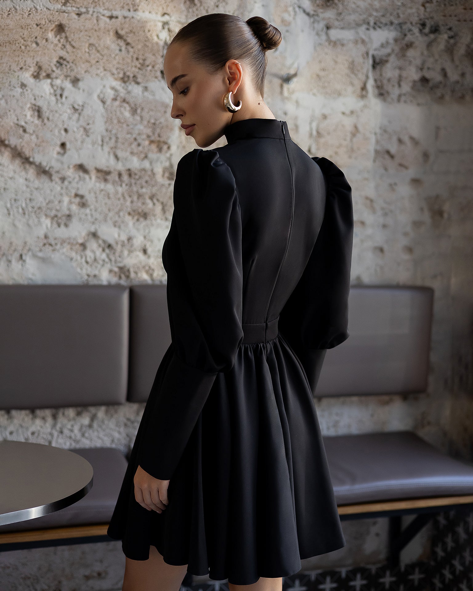Bella Black Choker-Neck Puff Sleeve Mini Dress