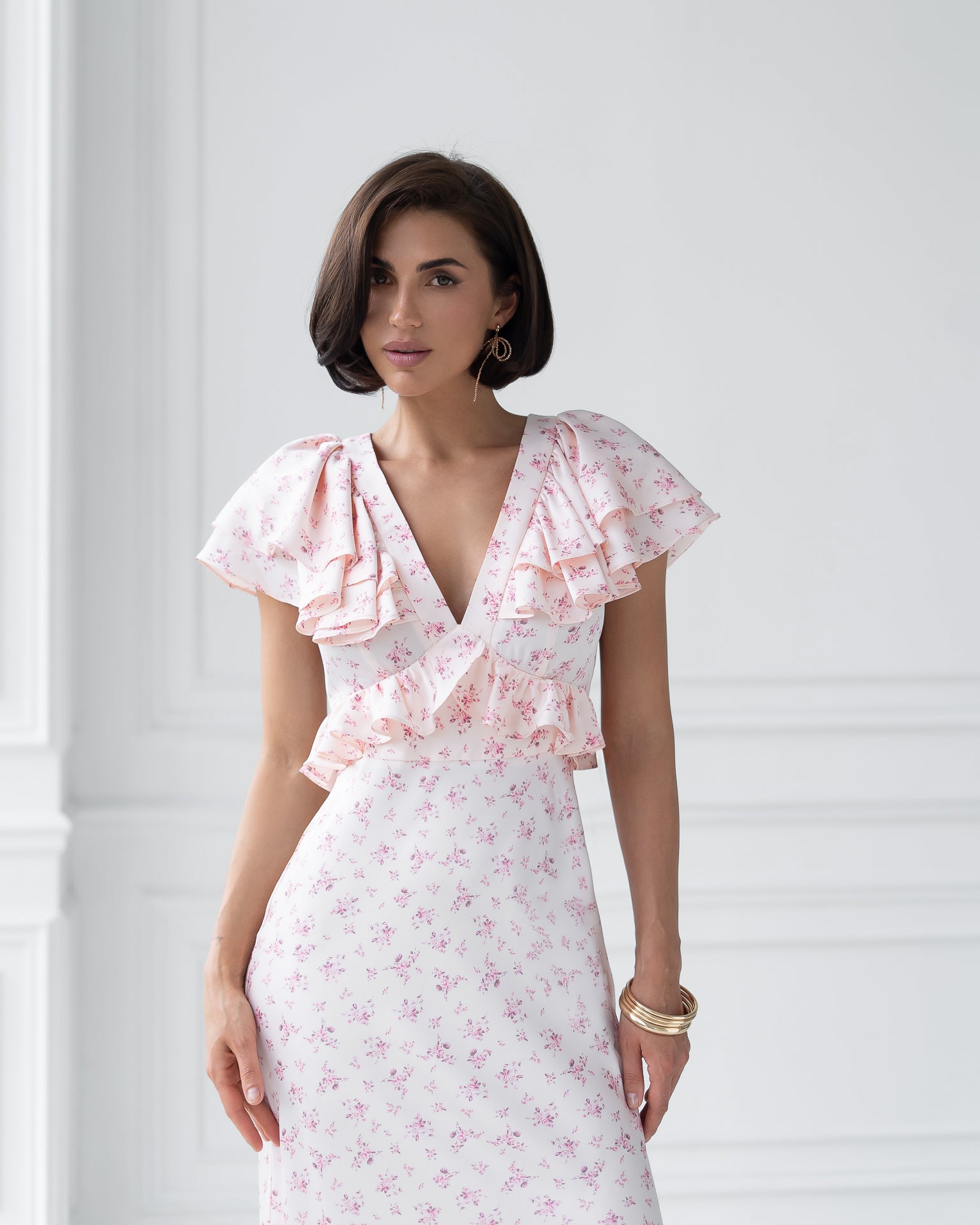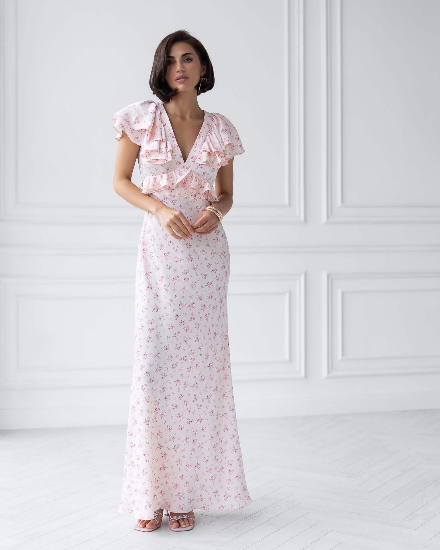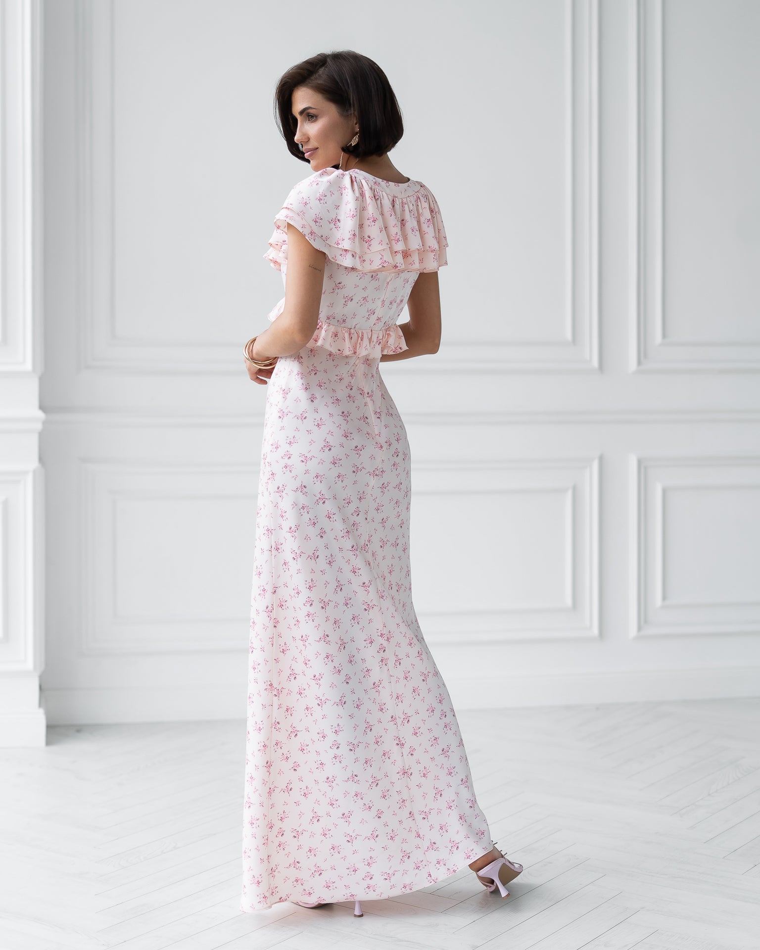 Léa White Floral Print Ruffled V-Neck Maxi Dress