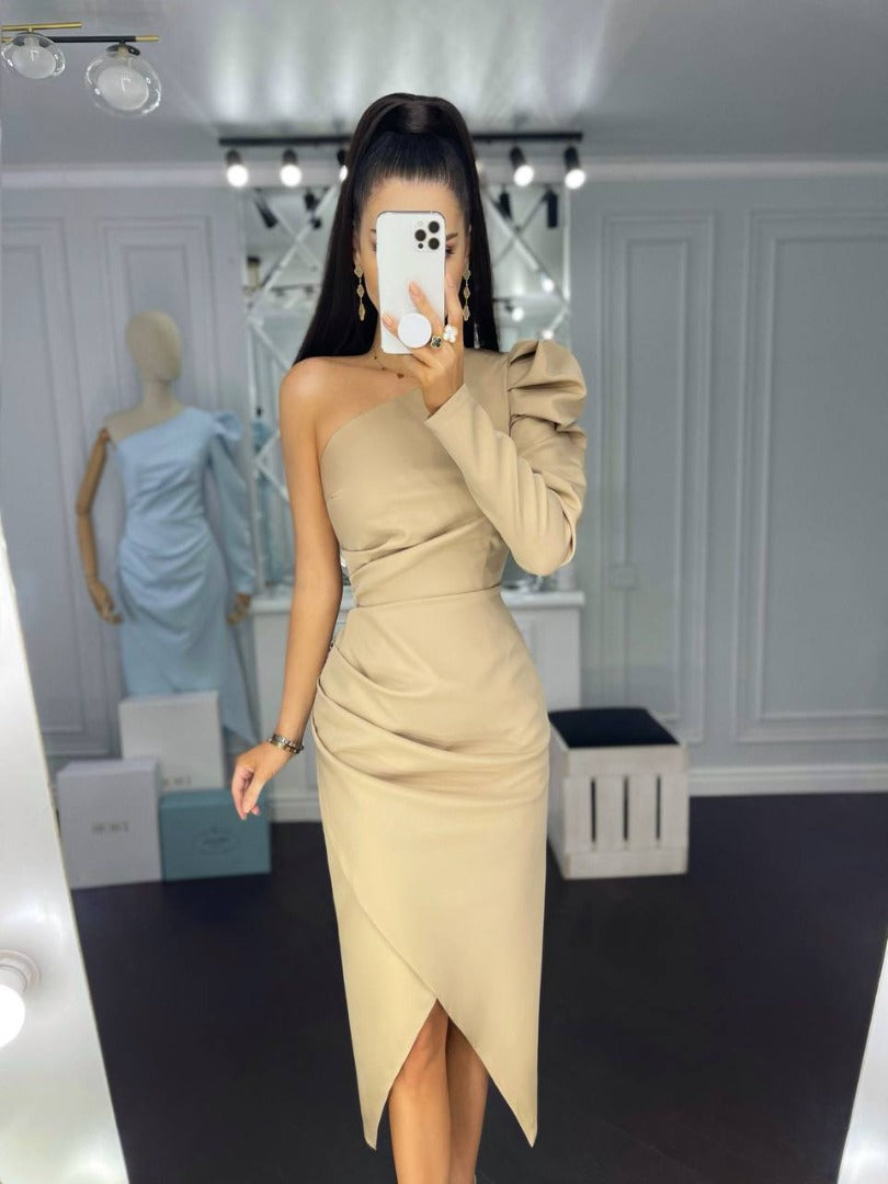 Beige One-Shoulder Tulip Midi Dress