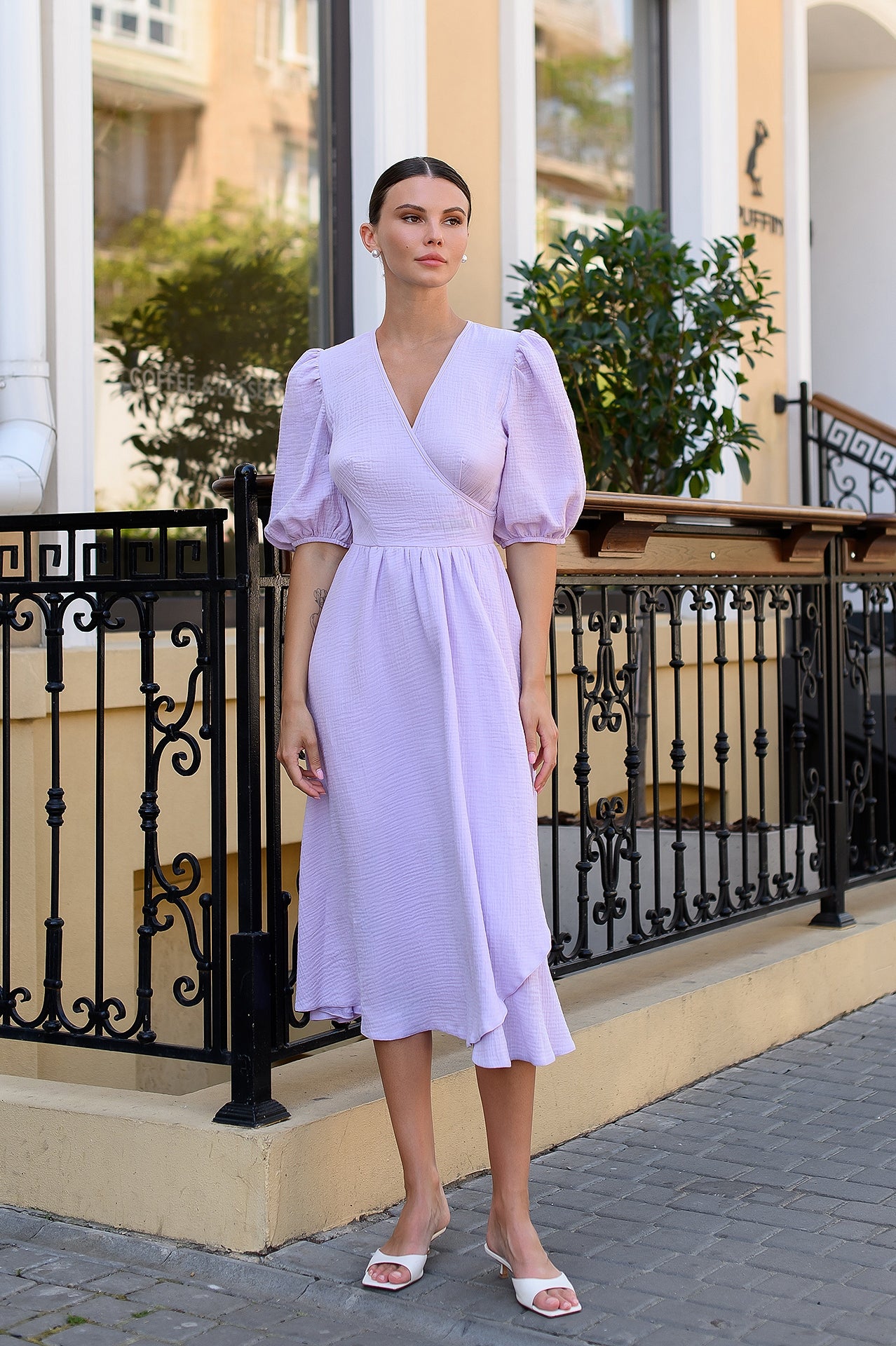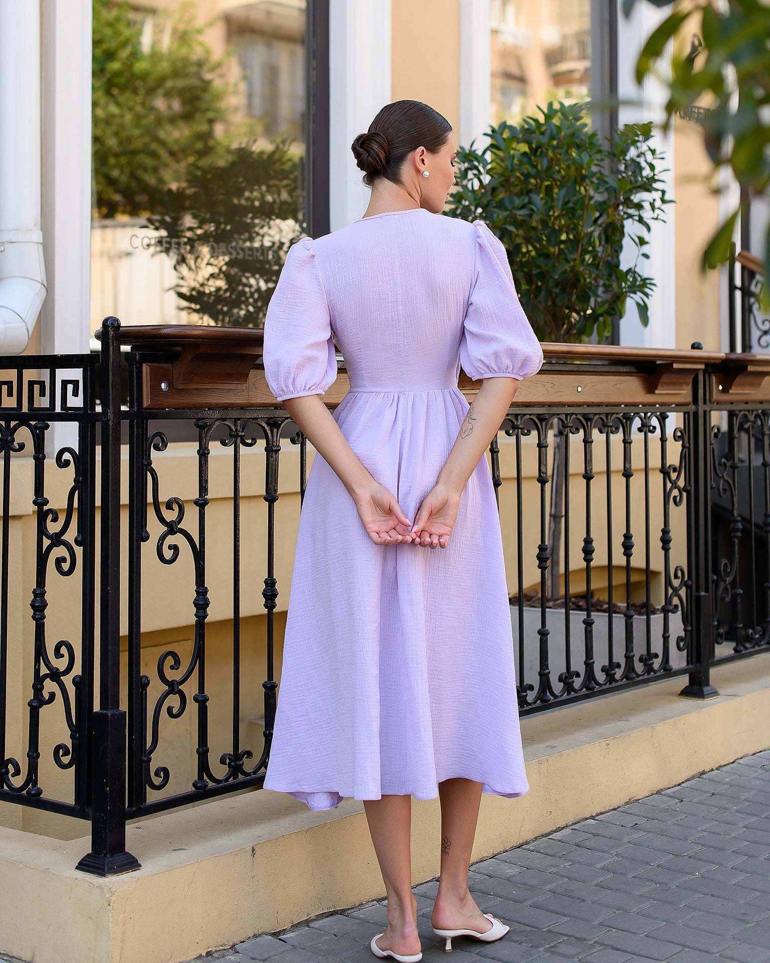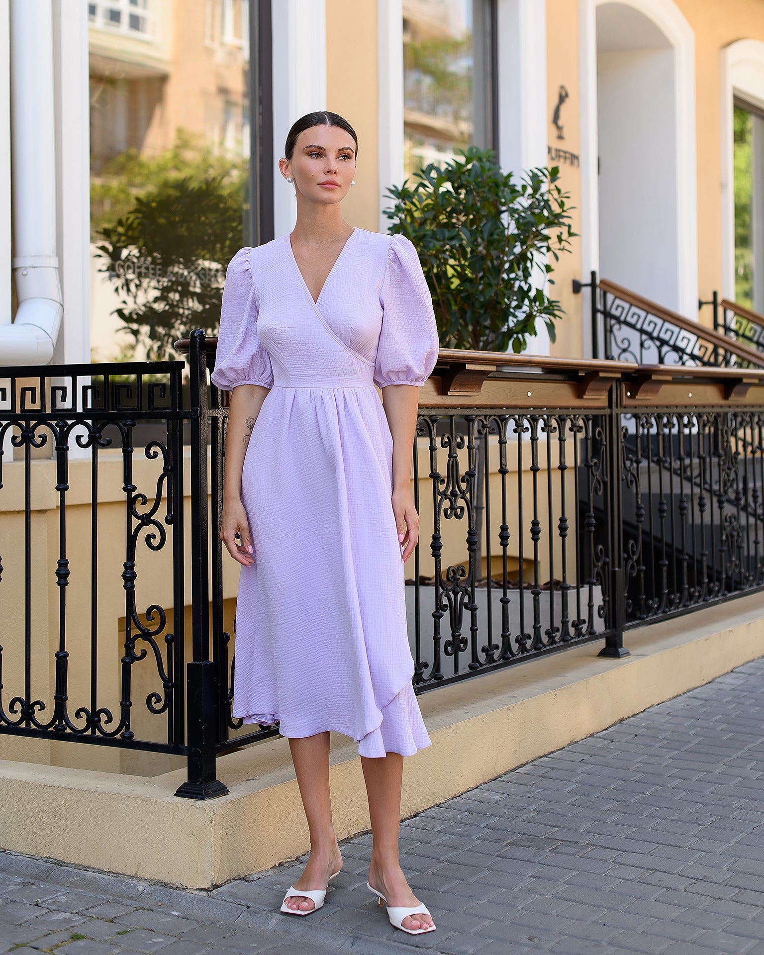 Lavender V-Neck Puff-Sleeve Midi Dress