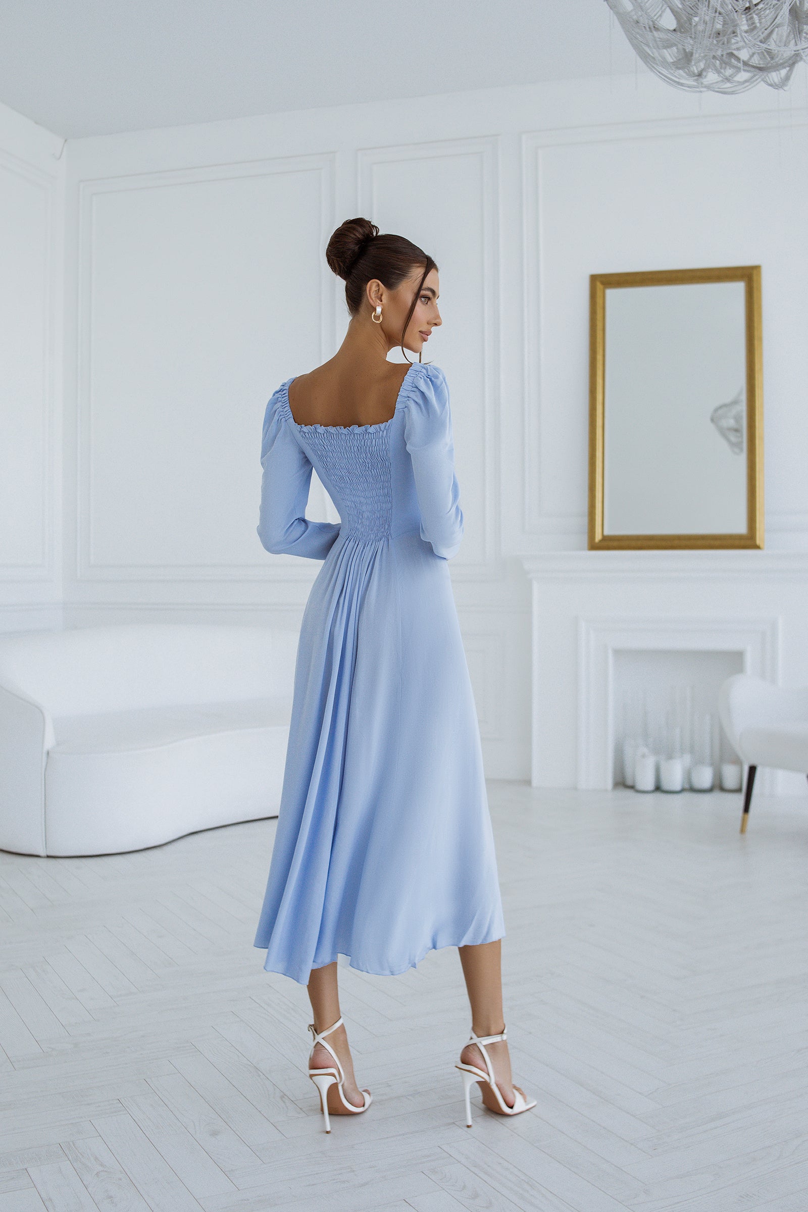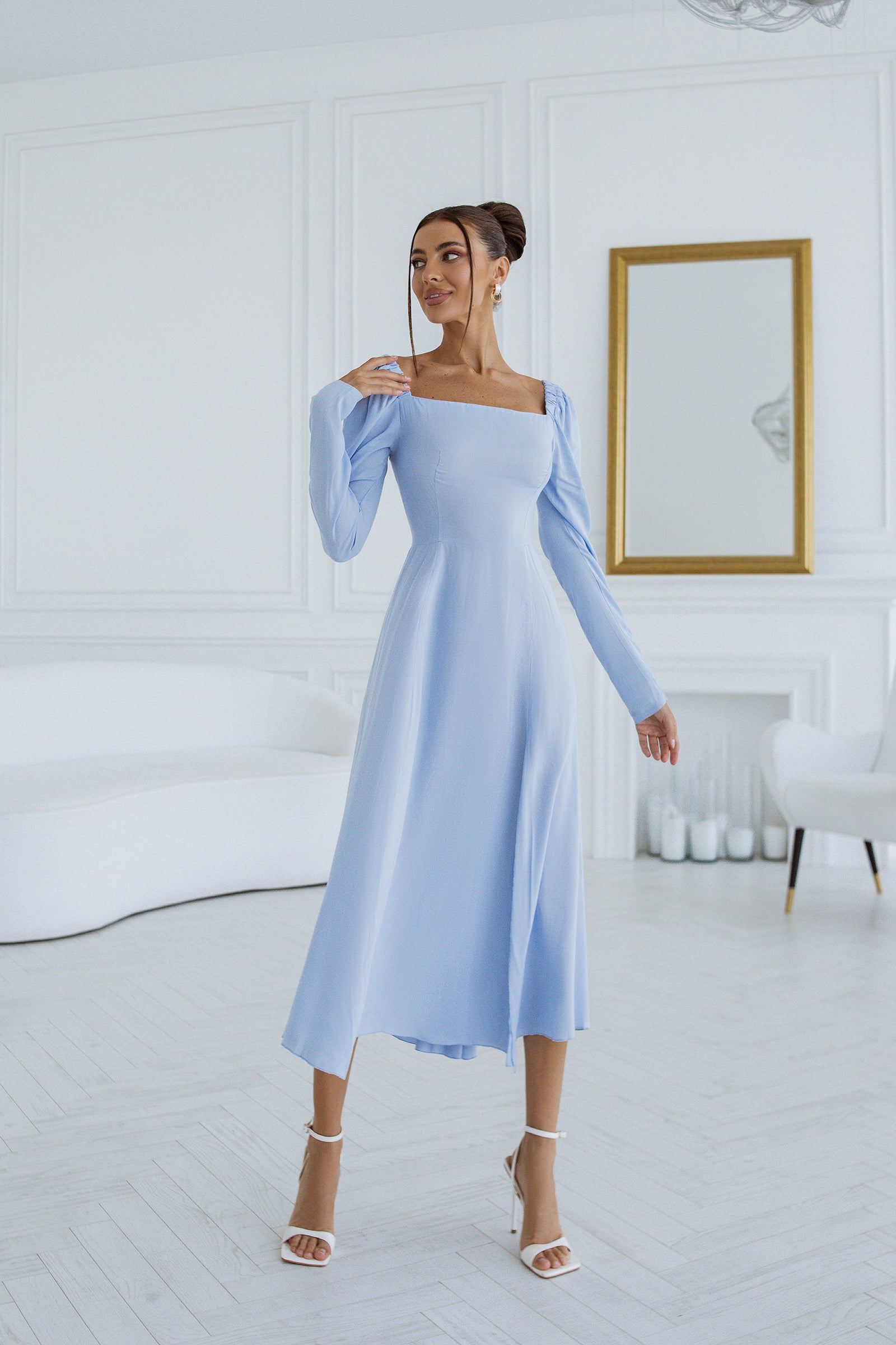 Sky-Blue Square Neck Puff-Sleeve Midi Dress