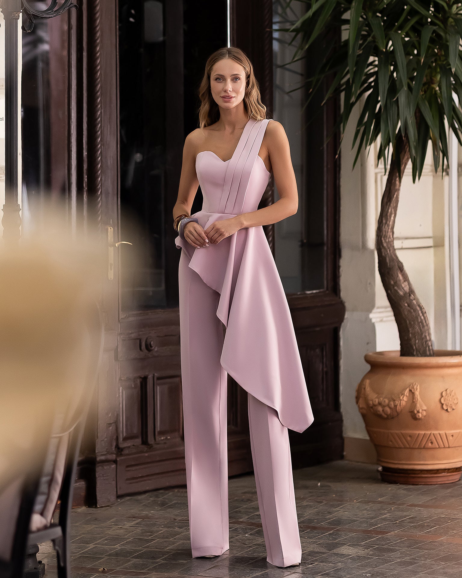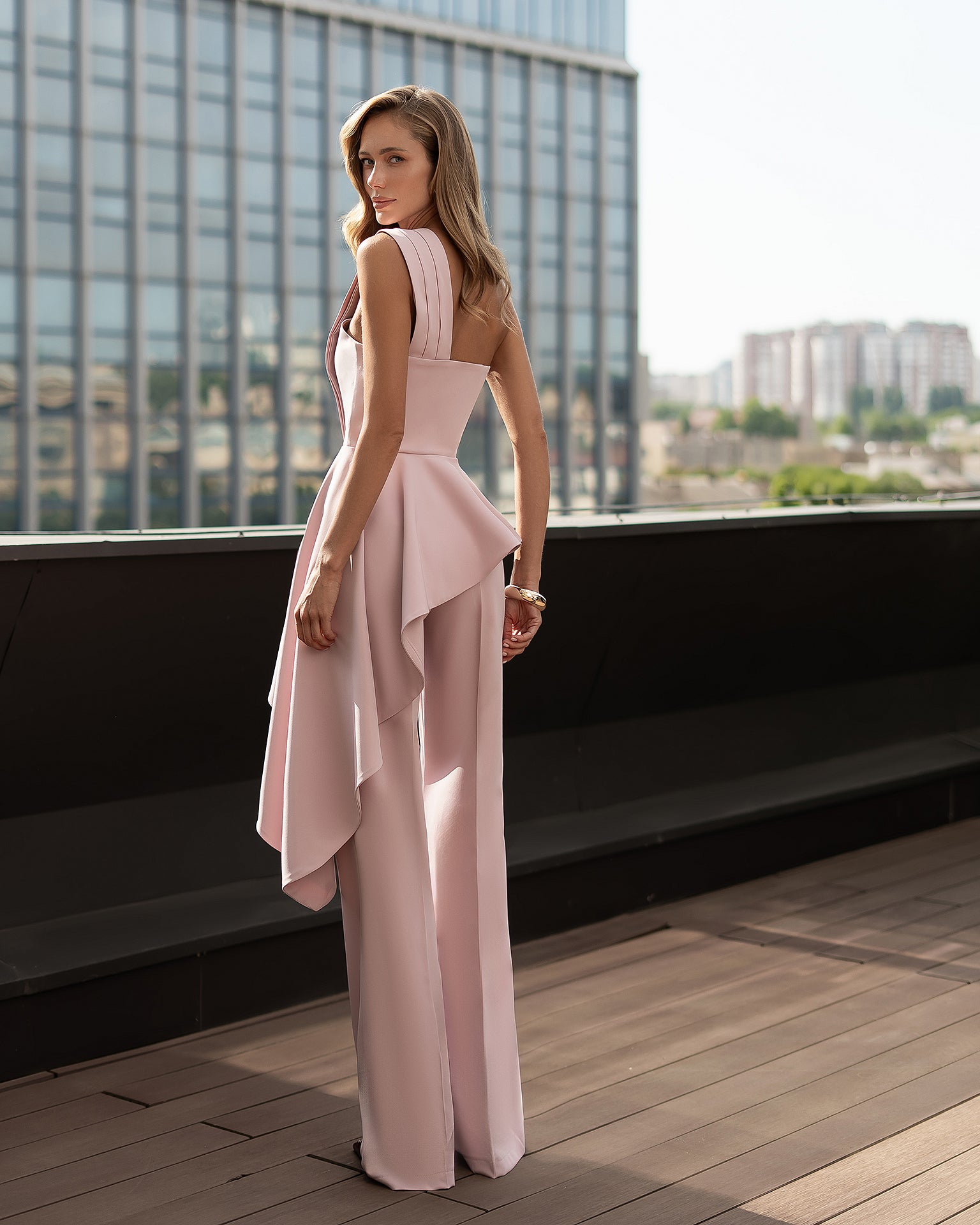 Dusty-Pink Pleated One-Shoulder Peplum Top & High-Waist Pants