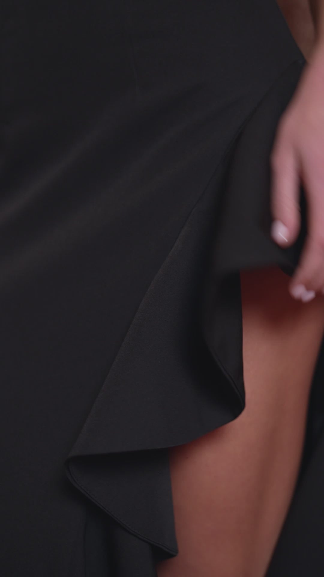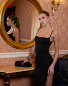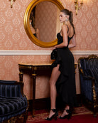Bianca Black Asymmetric Ruffled Slip Midi Dress