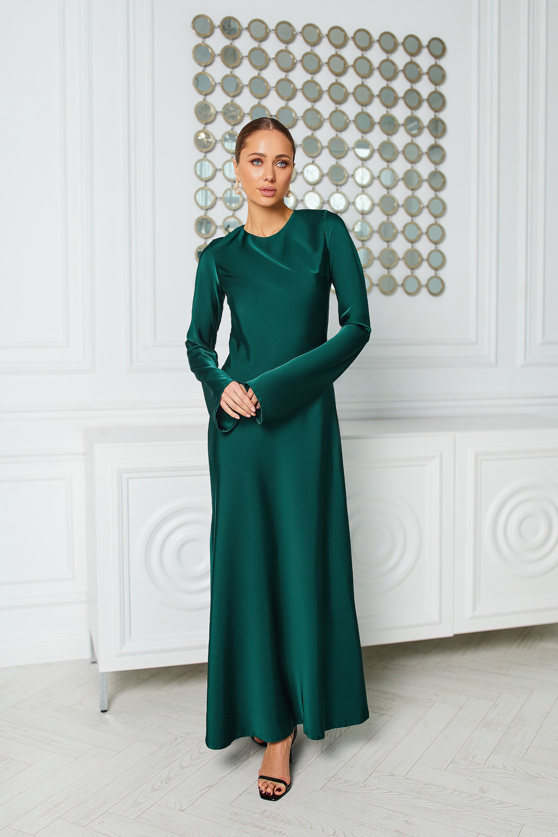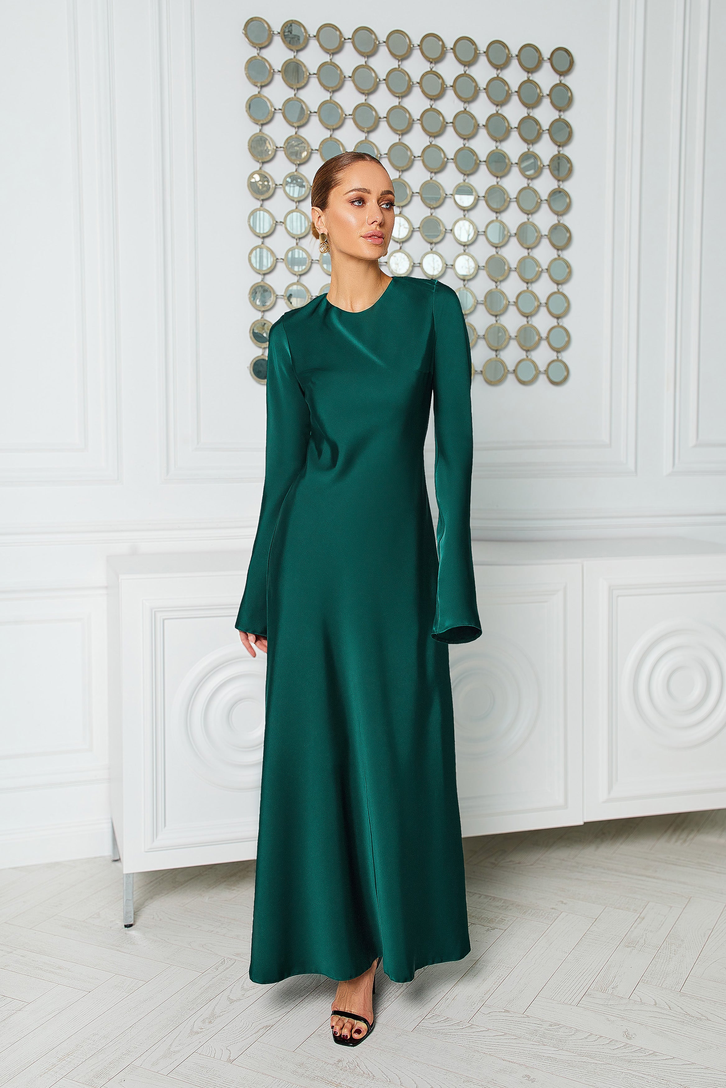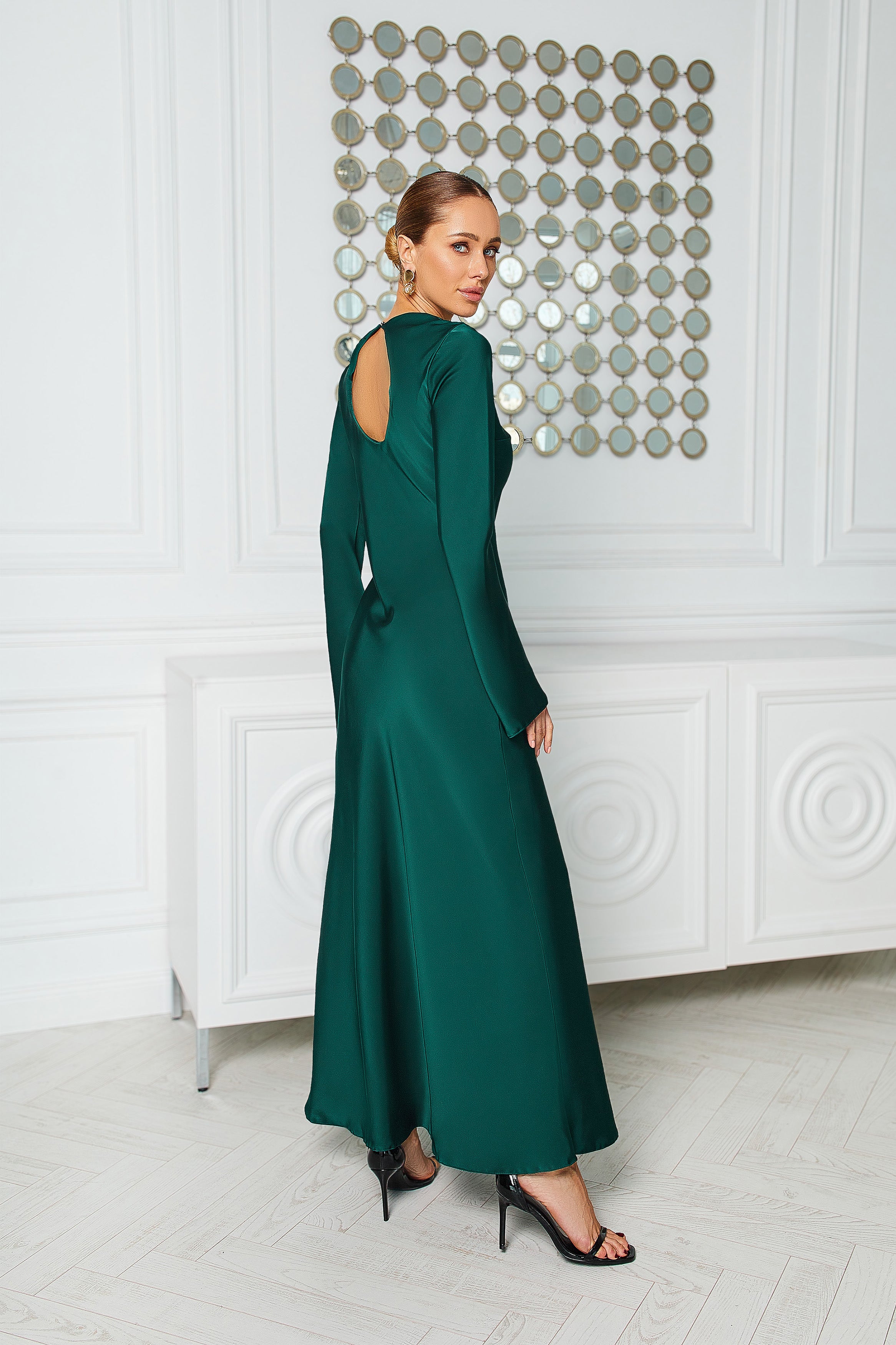 Alexa Emerald Satin Long Sleeve Maxi Dress