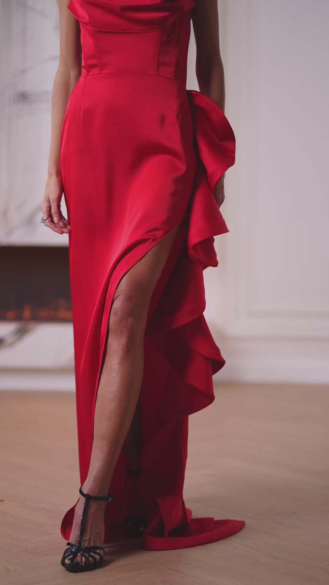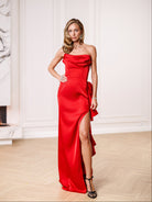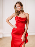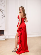 Estelle Red Satin Strapless Ruffled Side-Slit Maxi Dress
