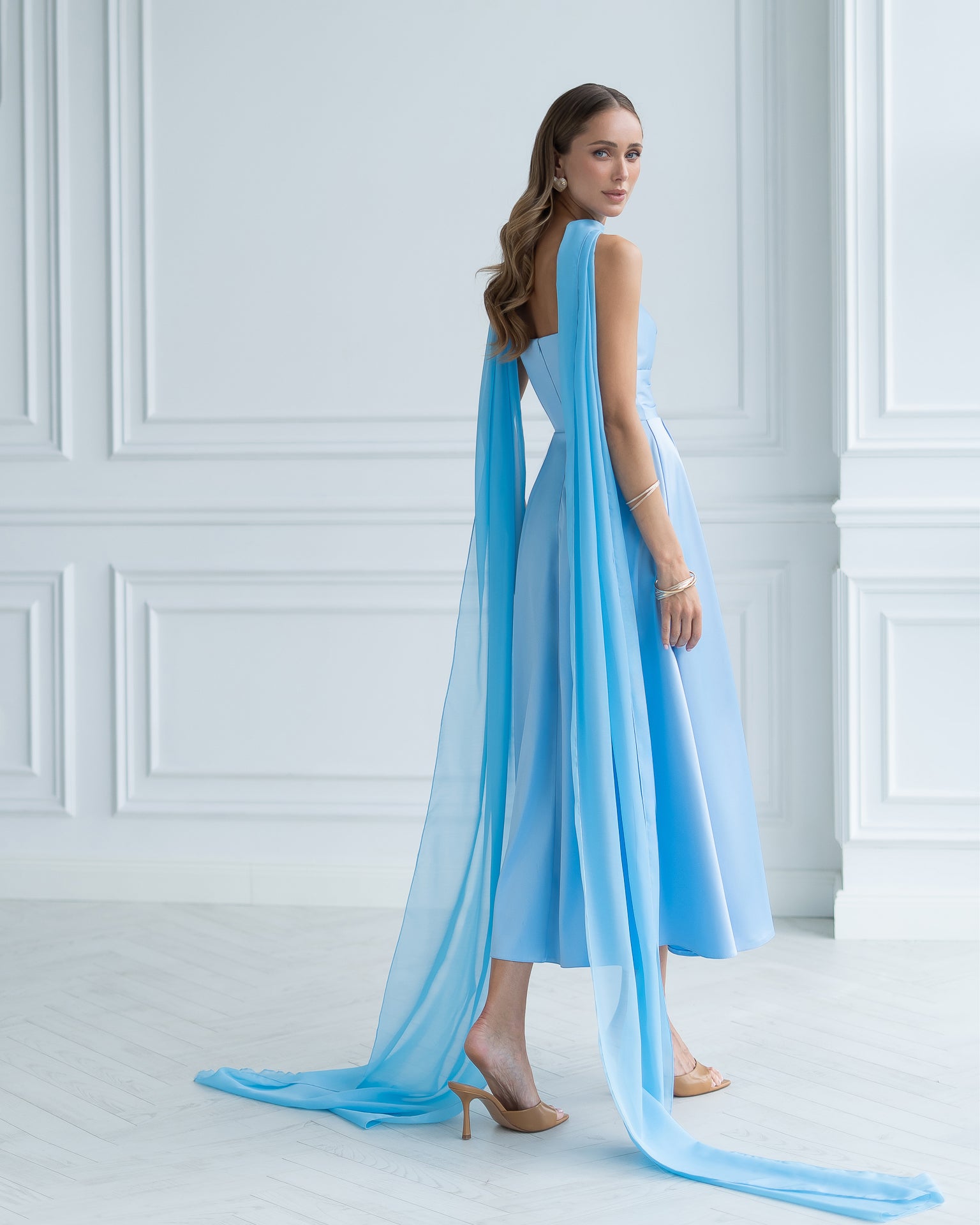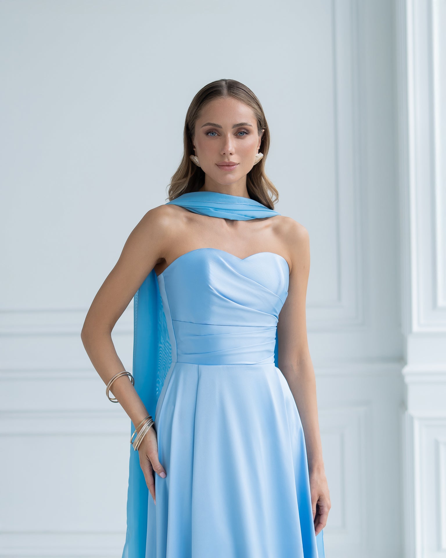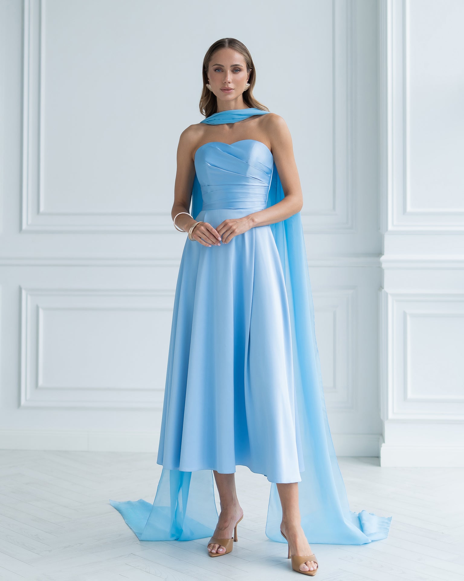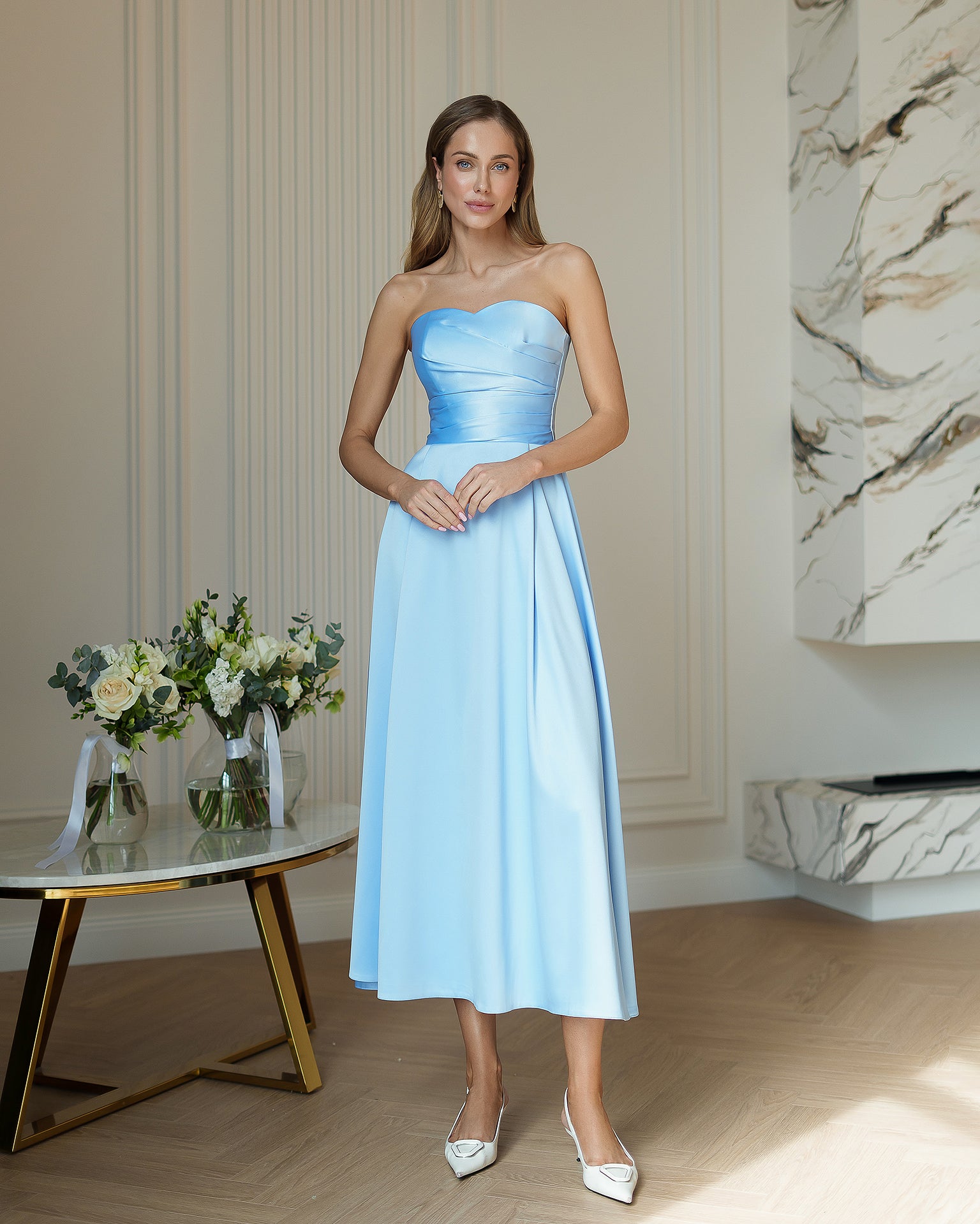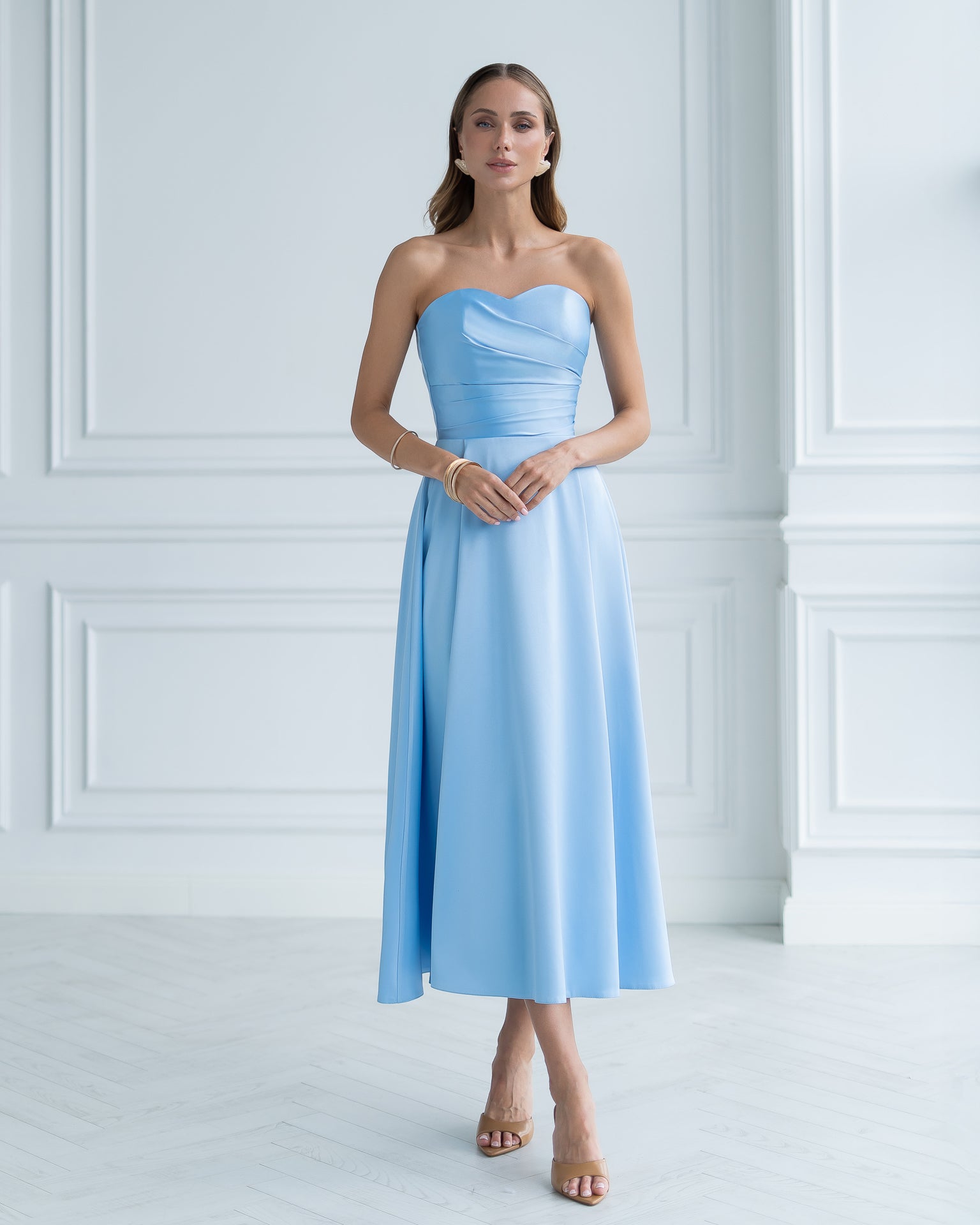 Nova Sky-Blue Satin Strapless Sweetheart Midi Dress
