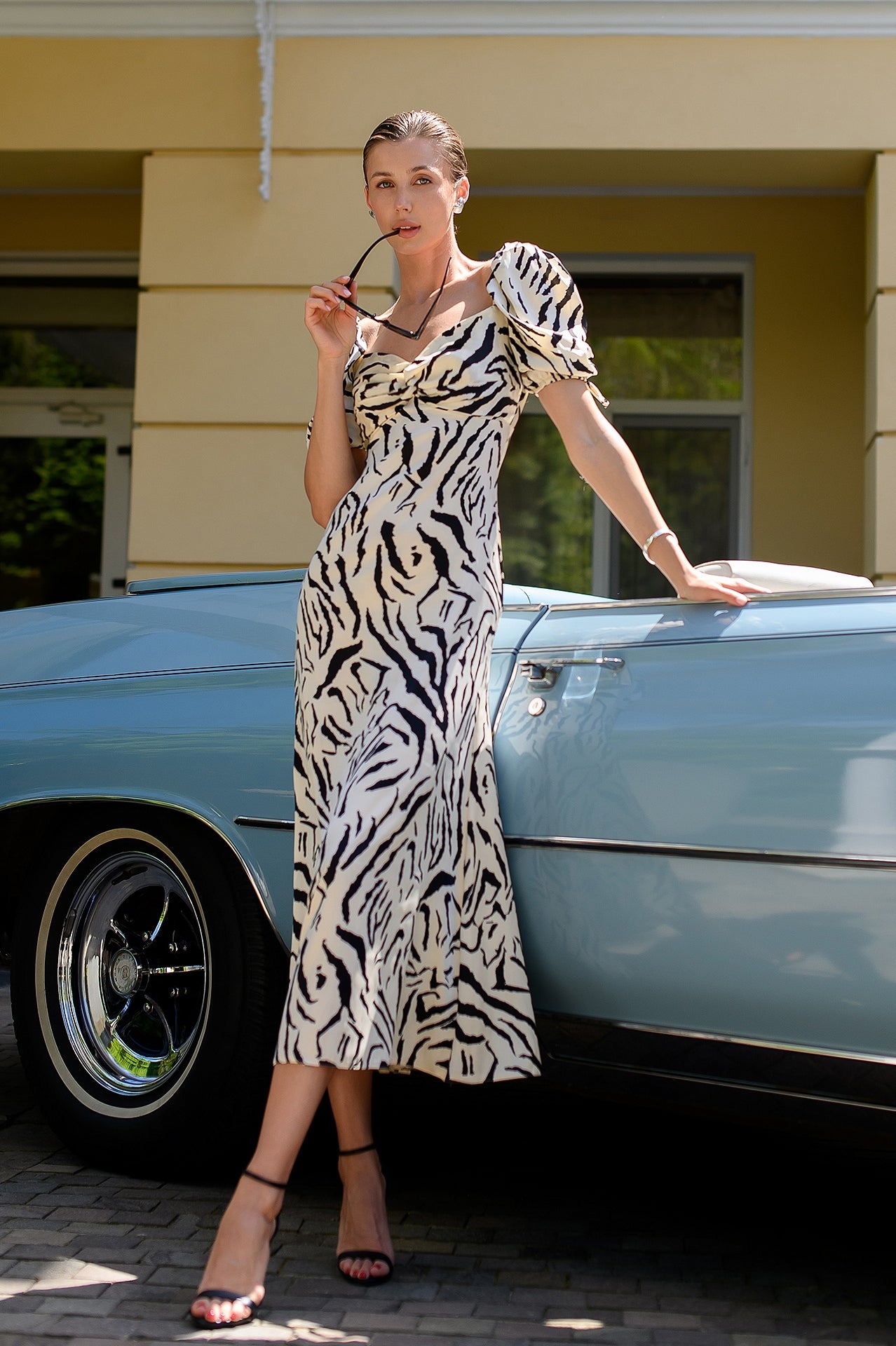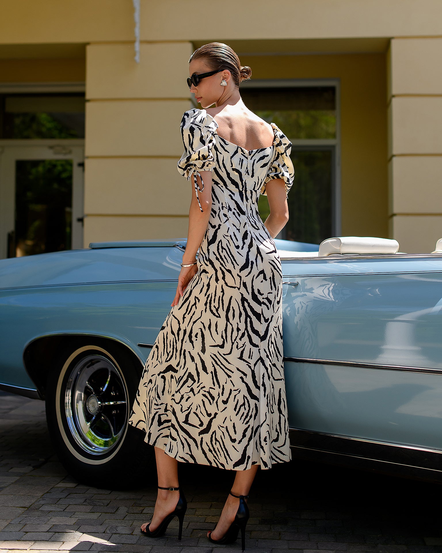 White-Black Floral-Print Puff Sleeve Midi Dress