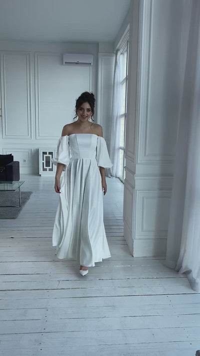 White Satin Puff-Sleeve Bridal Maxi Dress
