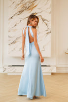 Kaia Sky-Blue Satin Halter-Neck Open-Back Maxi Dress