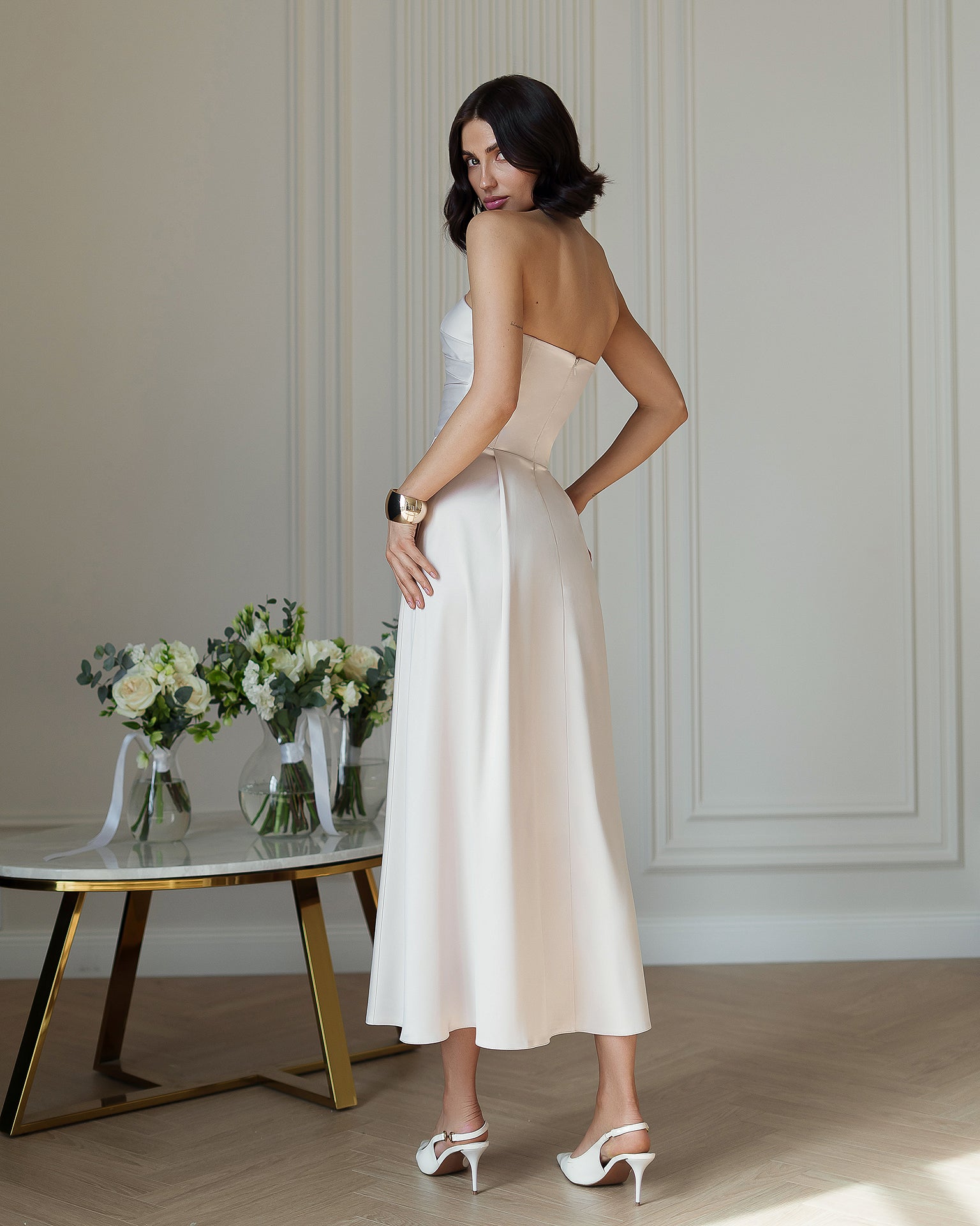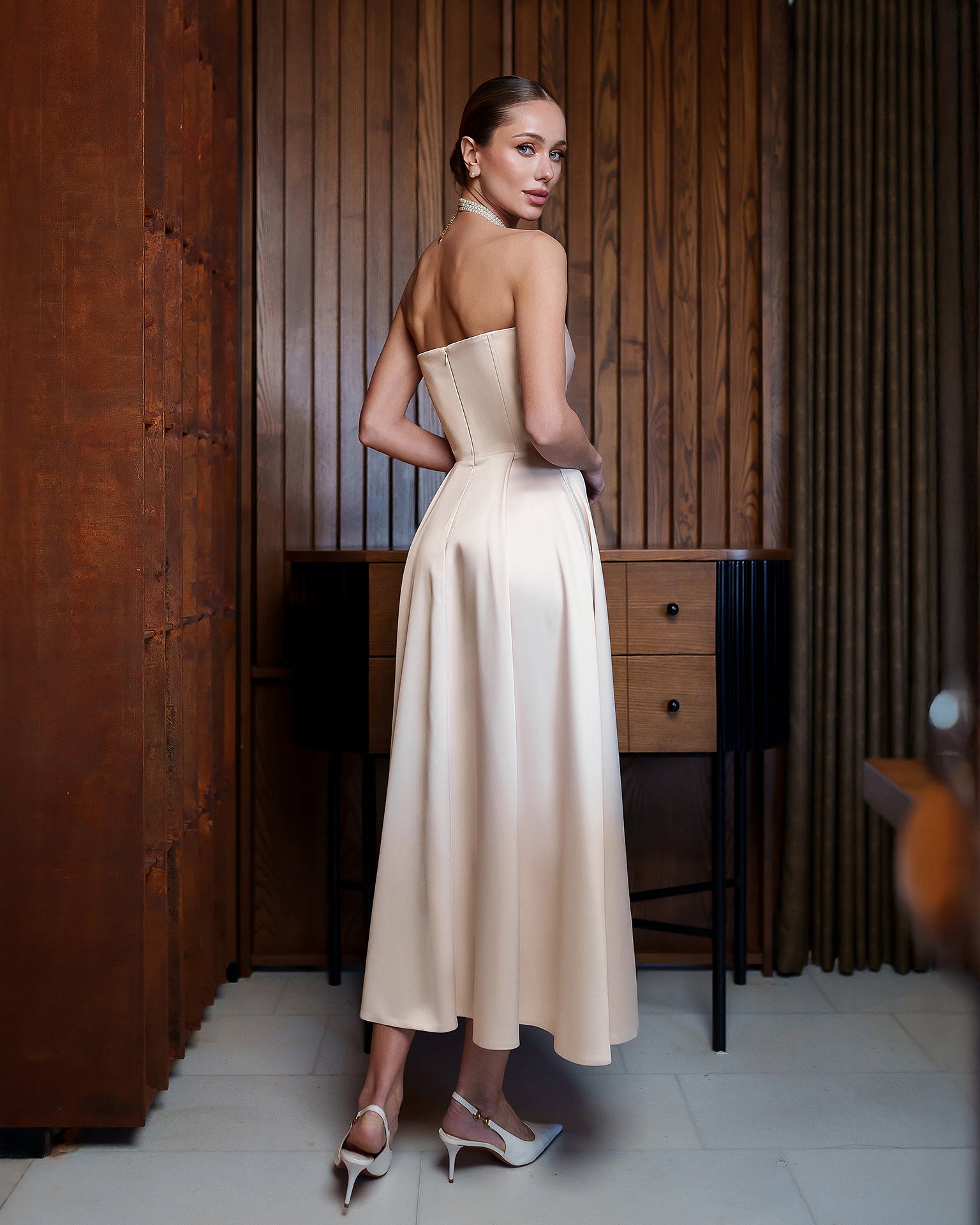 Nova Beige Satin Strapless Sweetheart Midi Dress