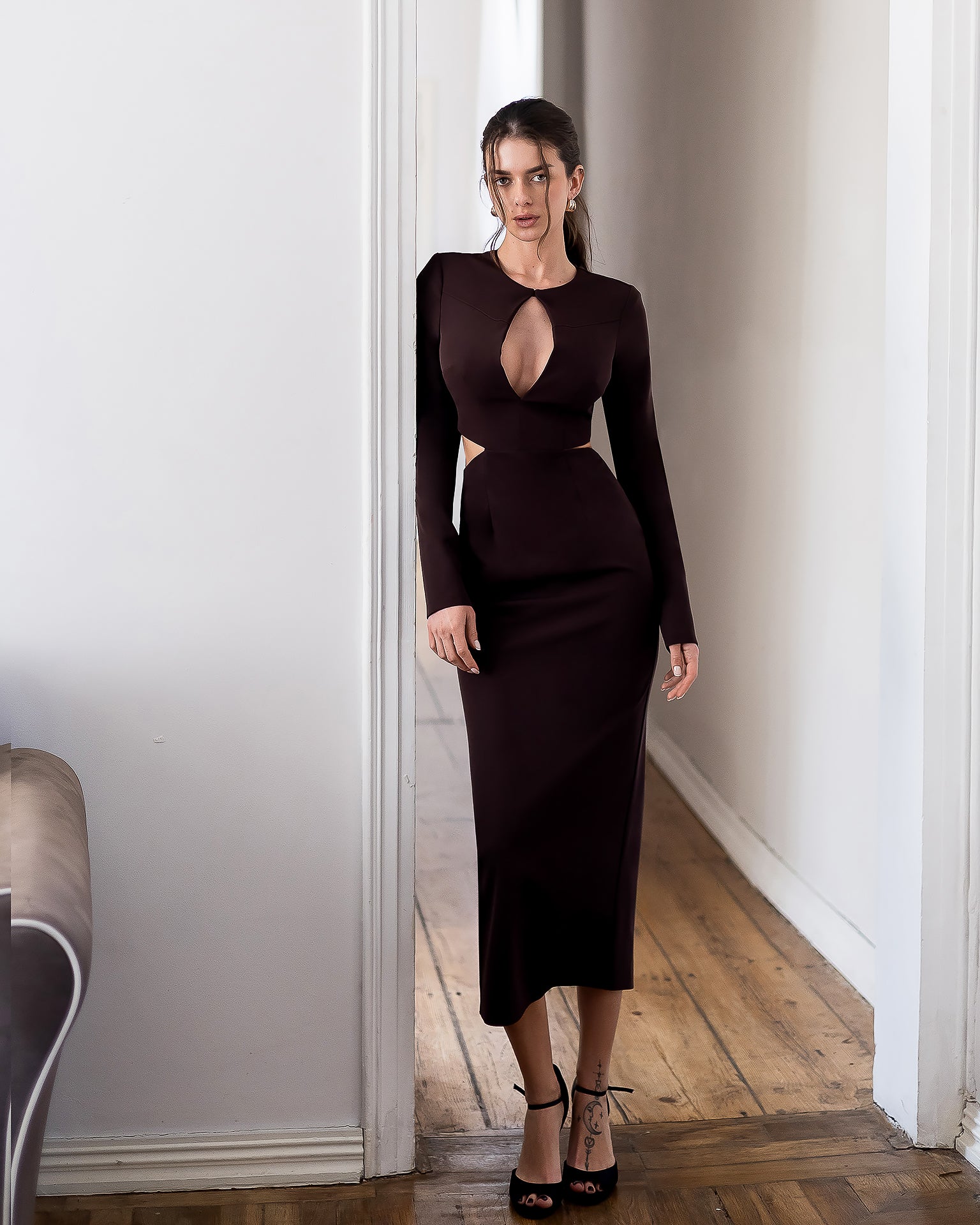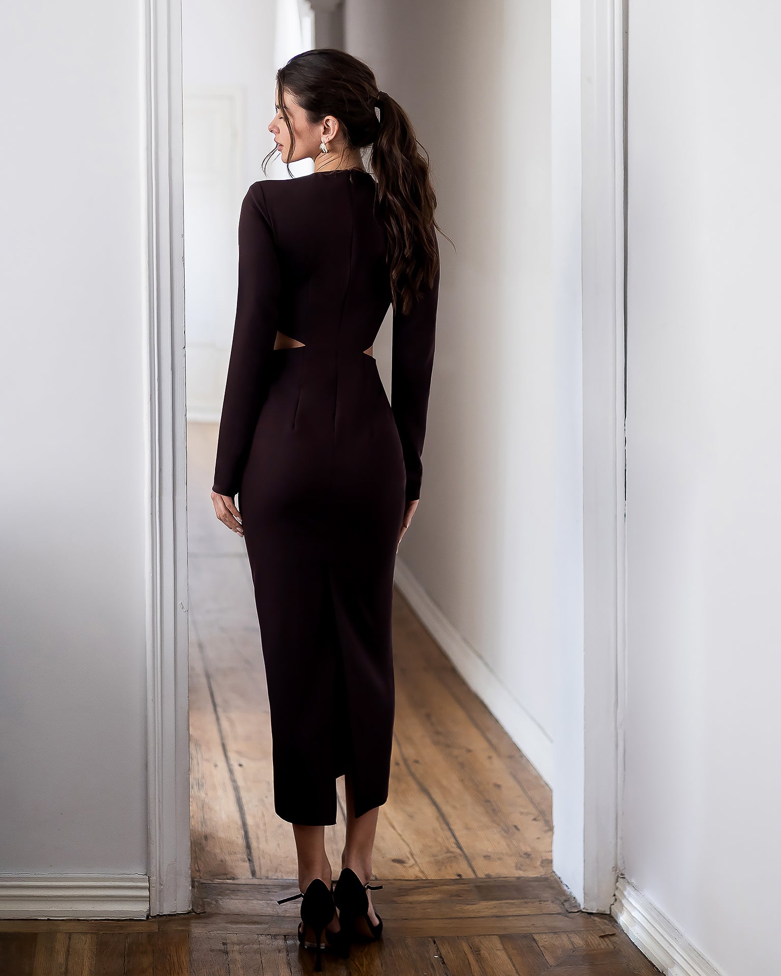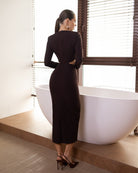 Vela Brown Keyhole Cut-Out Long-Sleeve Midi Dress