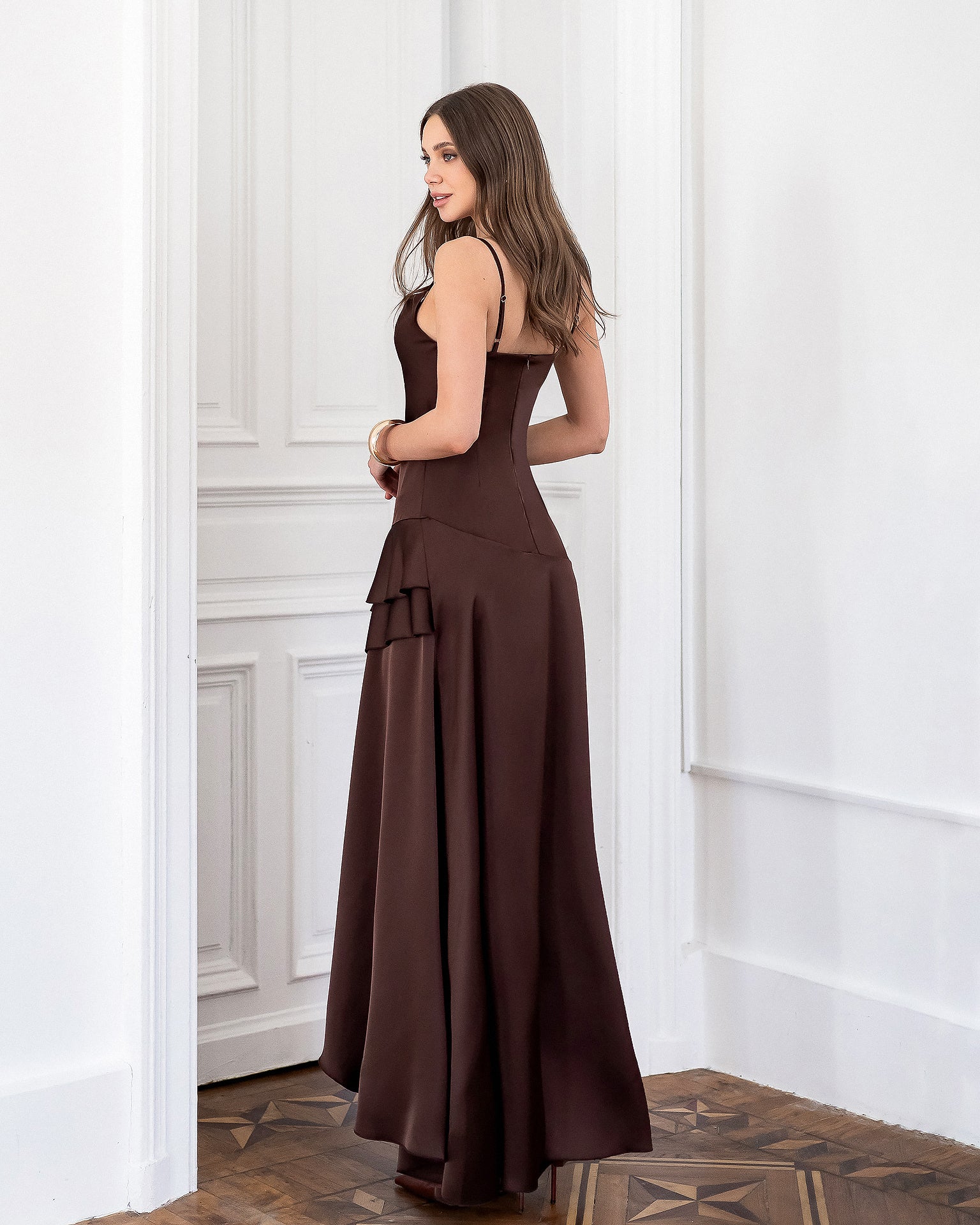 Lina Brown Satin Strappy Asymmetric Ruffle Maxi Dress