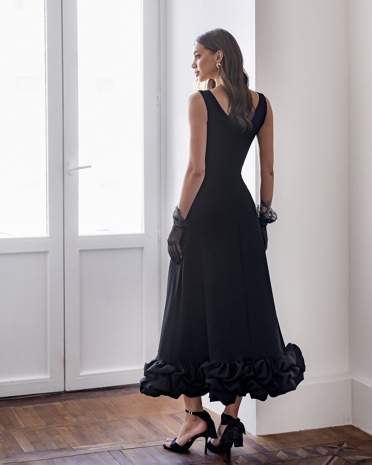Vela Black Square-Neck Ruffle Hem Midi Dress