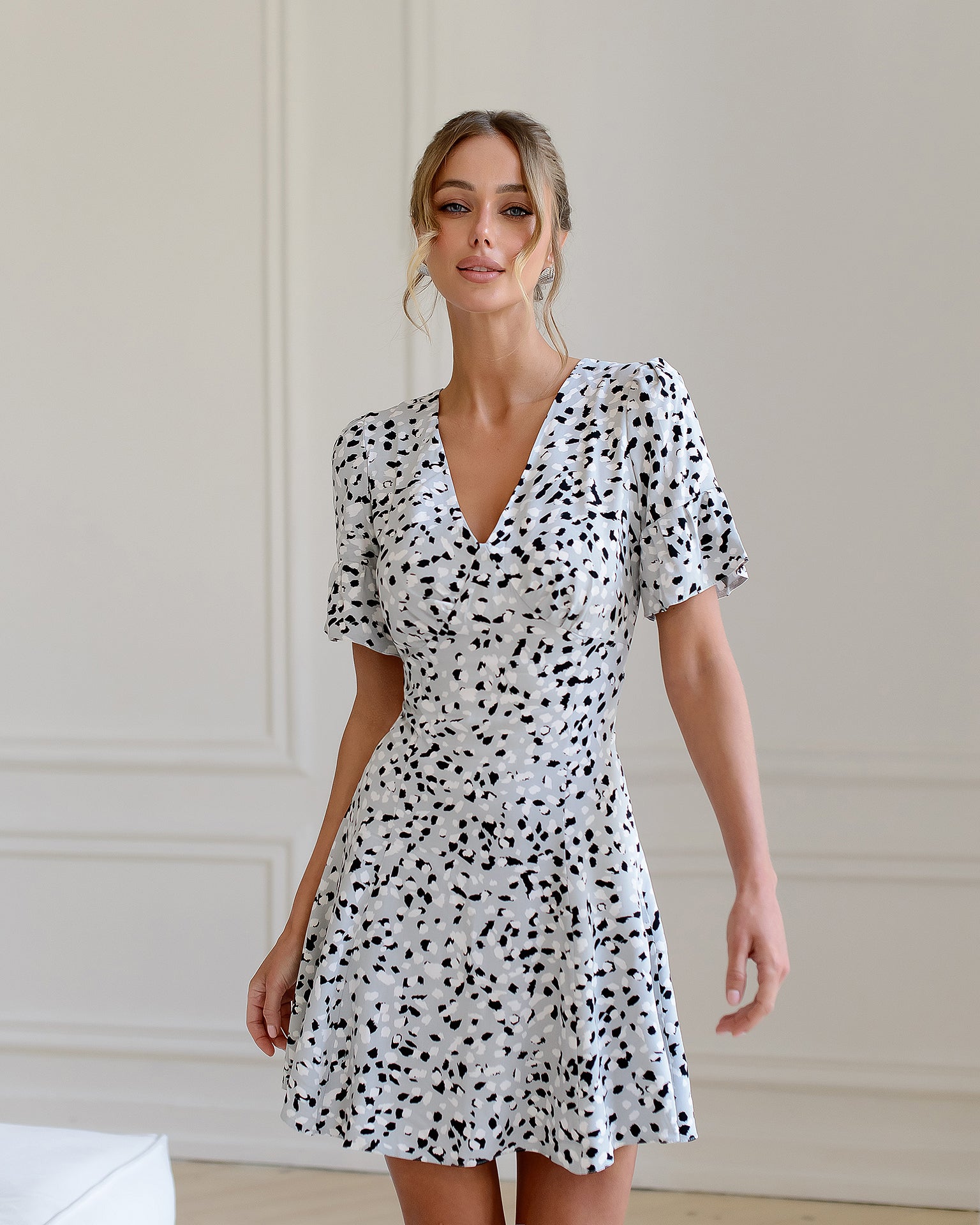 Grey Floral Print Short Sleeve Mini Dress