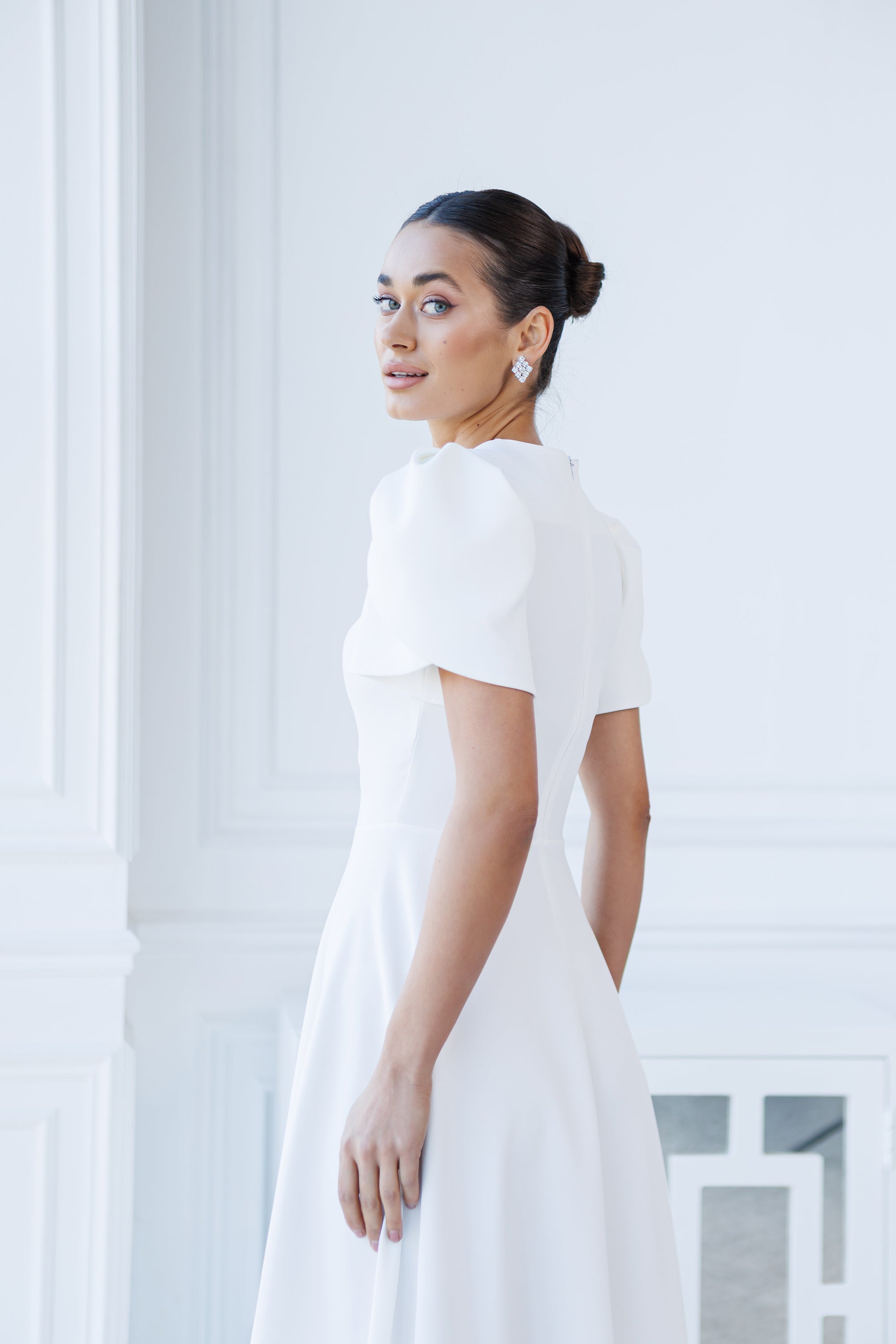 Alexa White Round Neck Puff-Sleeve Midi Dress