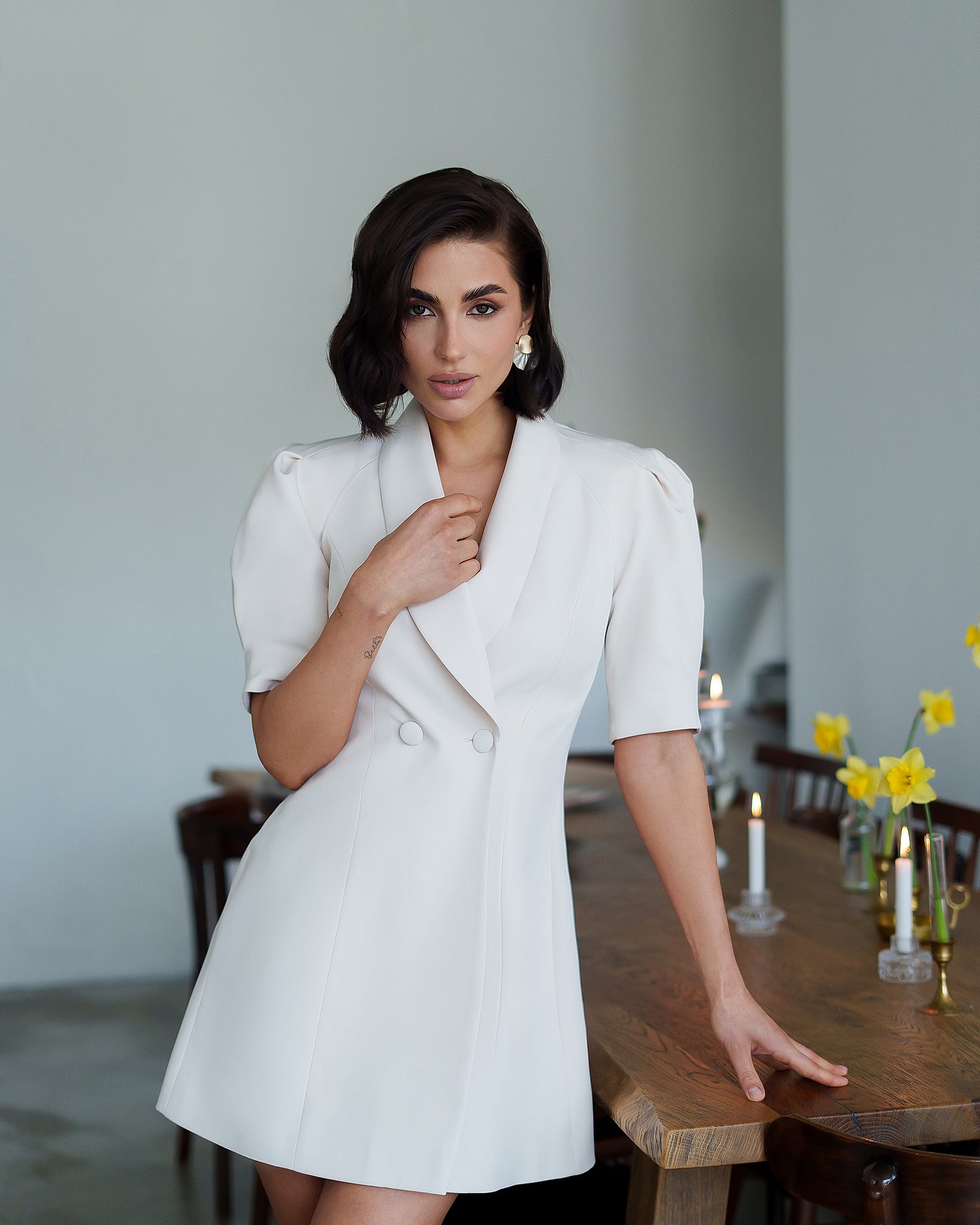 White Wrap Shawl Lapel Puff-Sleeve Mini Dress