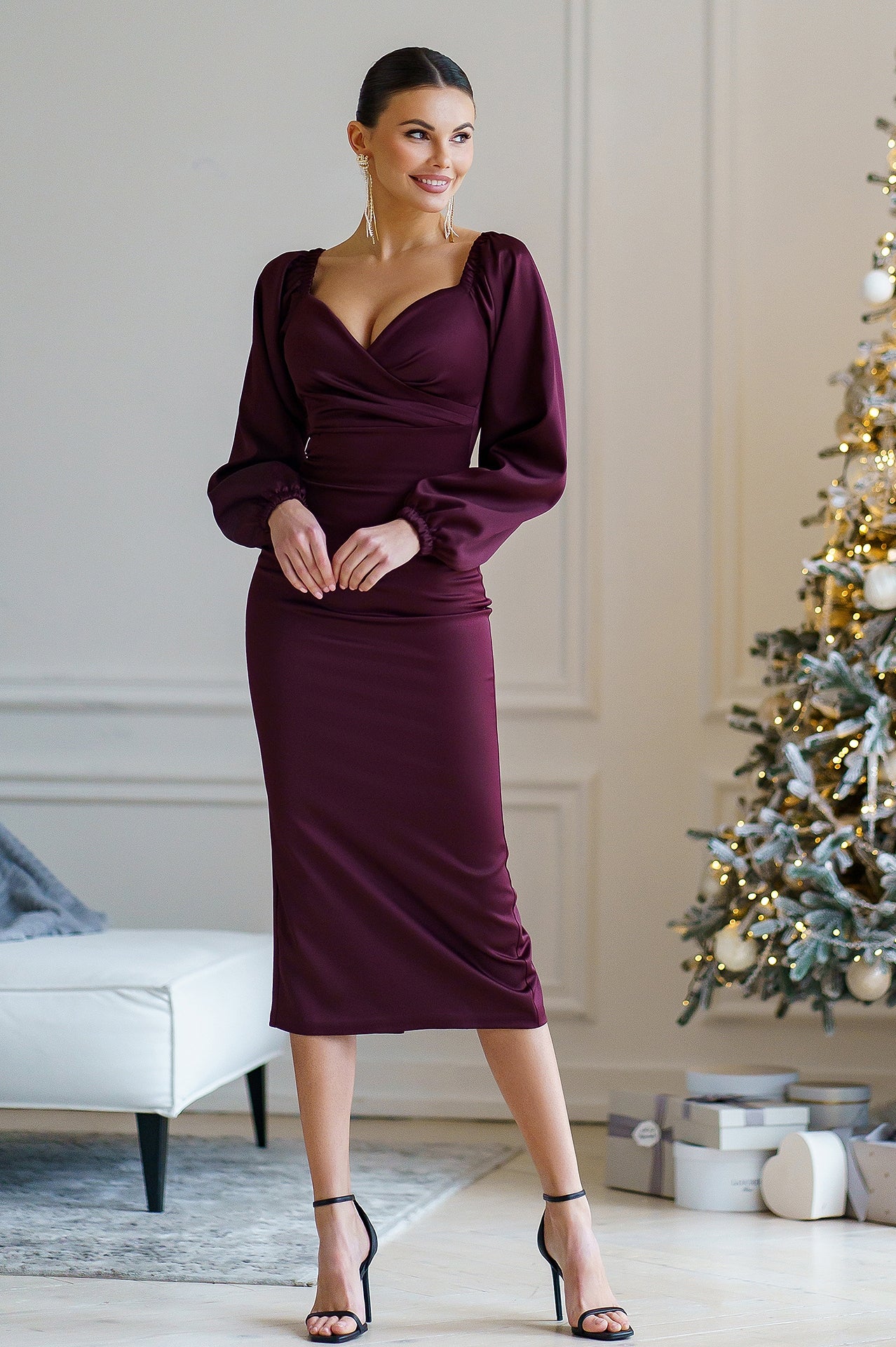 Bordeaux Satin Puff-Sleeve Midi Dress