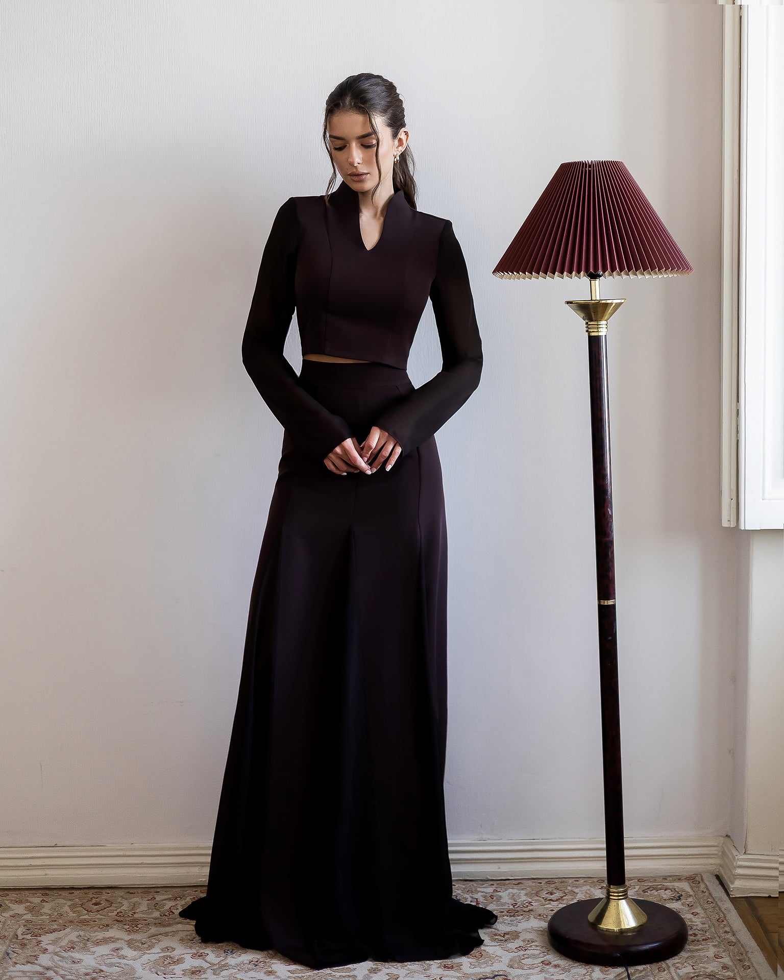 Mira Brown Sheer Sleeve V-Neck Top & Maxi Skirt 2-Piece Set