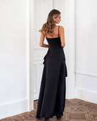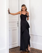 Lina Black Satin Strappy Asymmetric Ruffle Maxi Dress