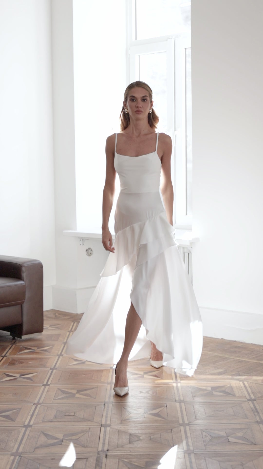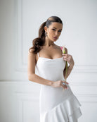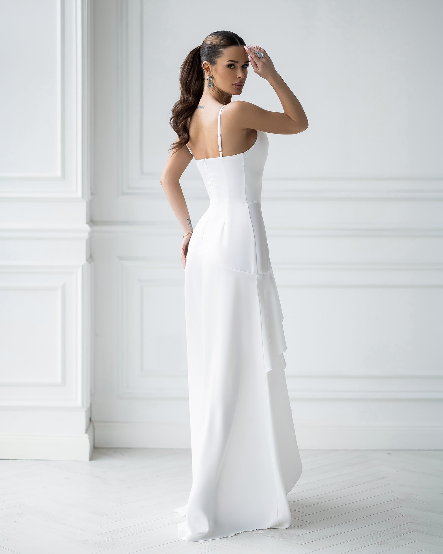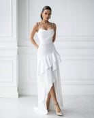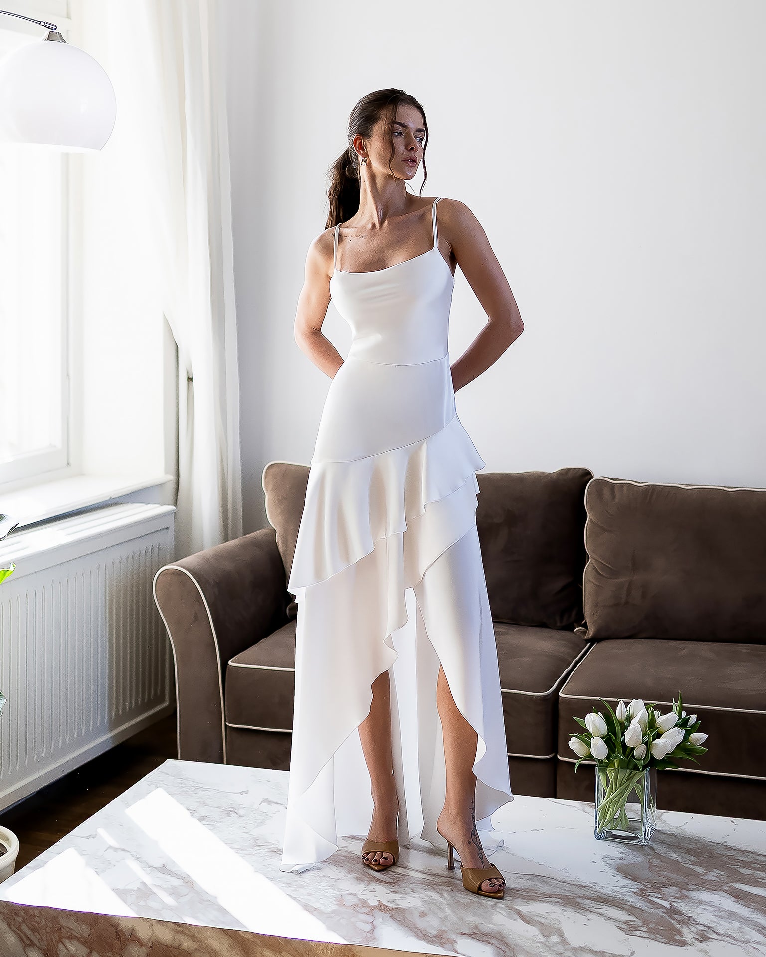 Lina White Satin Strappy Asymmetric Ruffle Maxi Dress
