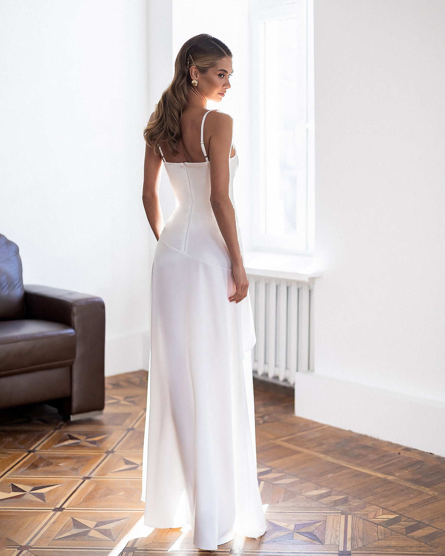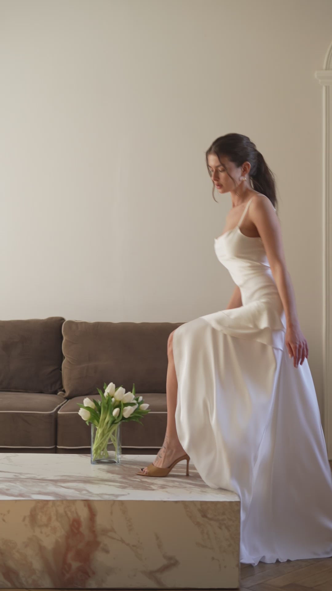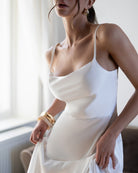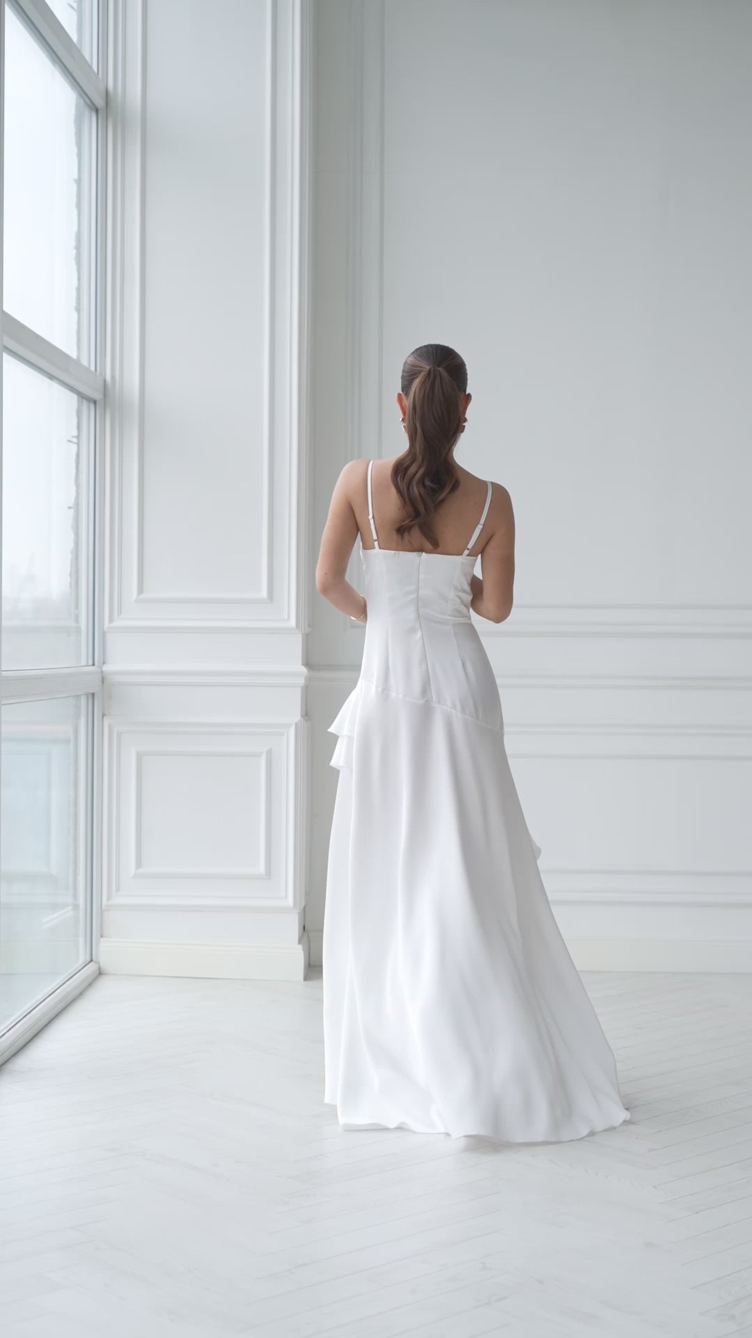Lina White Satin Strappy Asymmetric Ruffle Maxi Dress