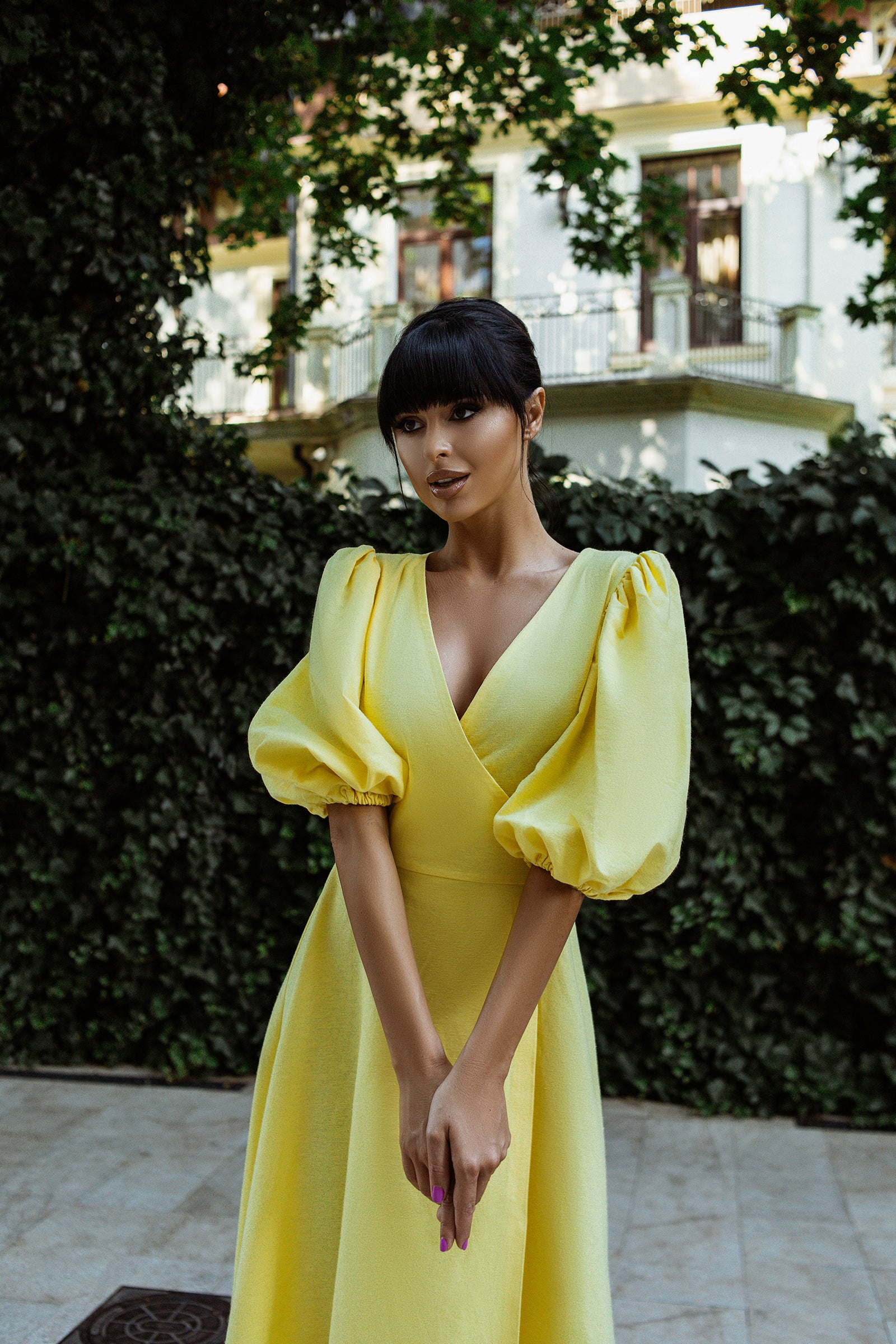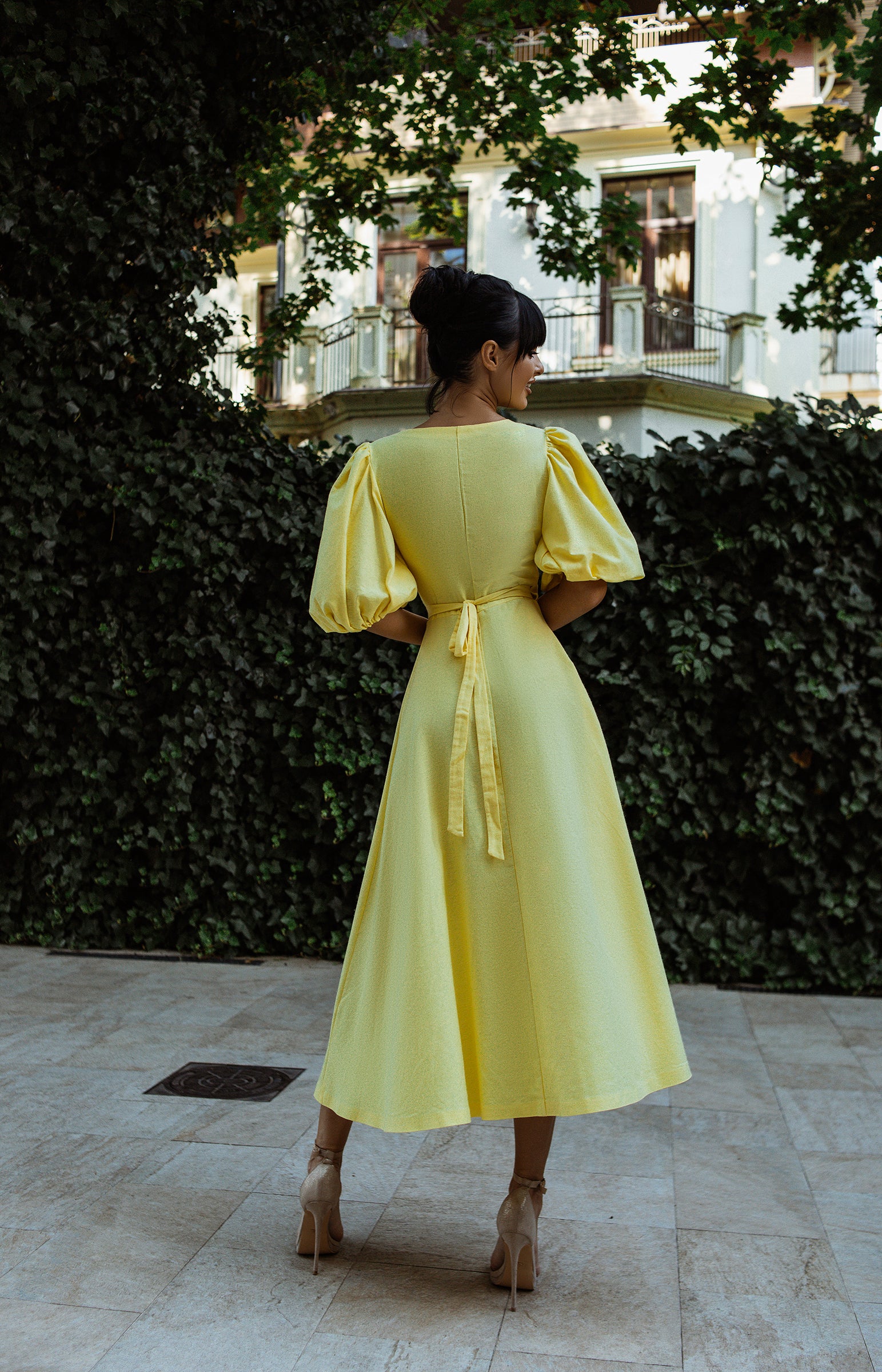 Yellow Puff-Sleeve Wrap Midi Dress