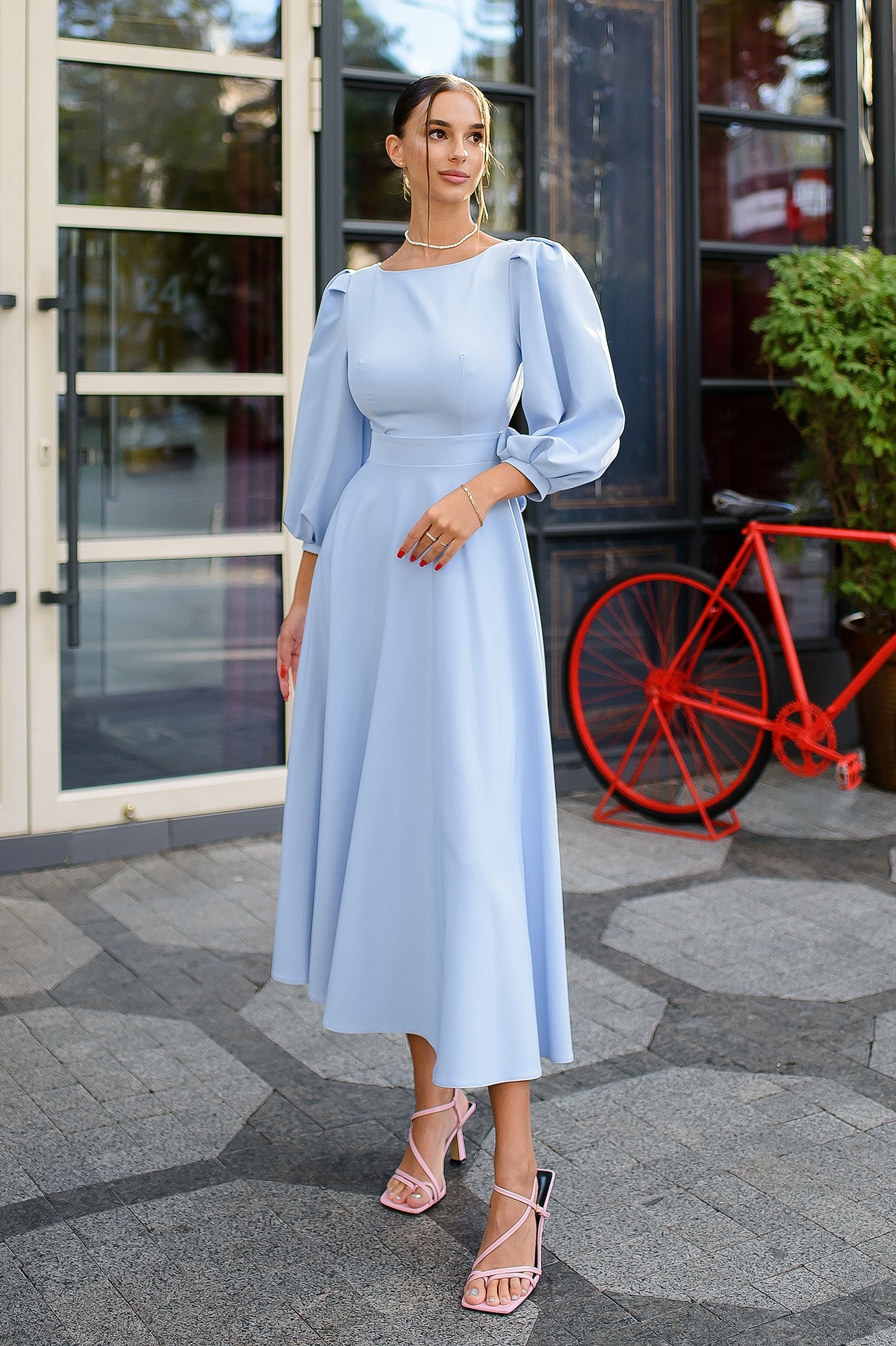 Sky-Blue Backless Puff Sleeve Midi Dress