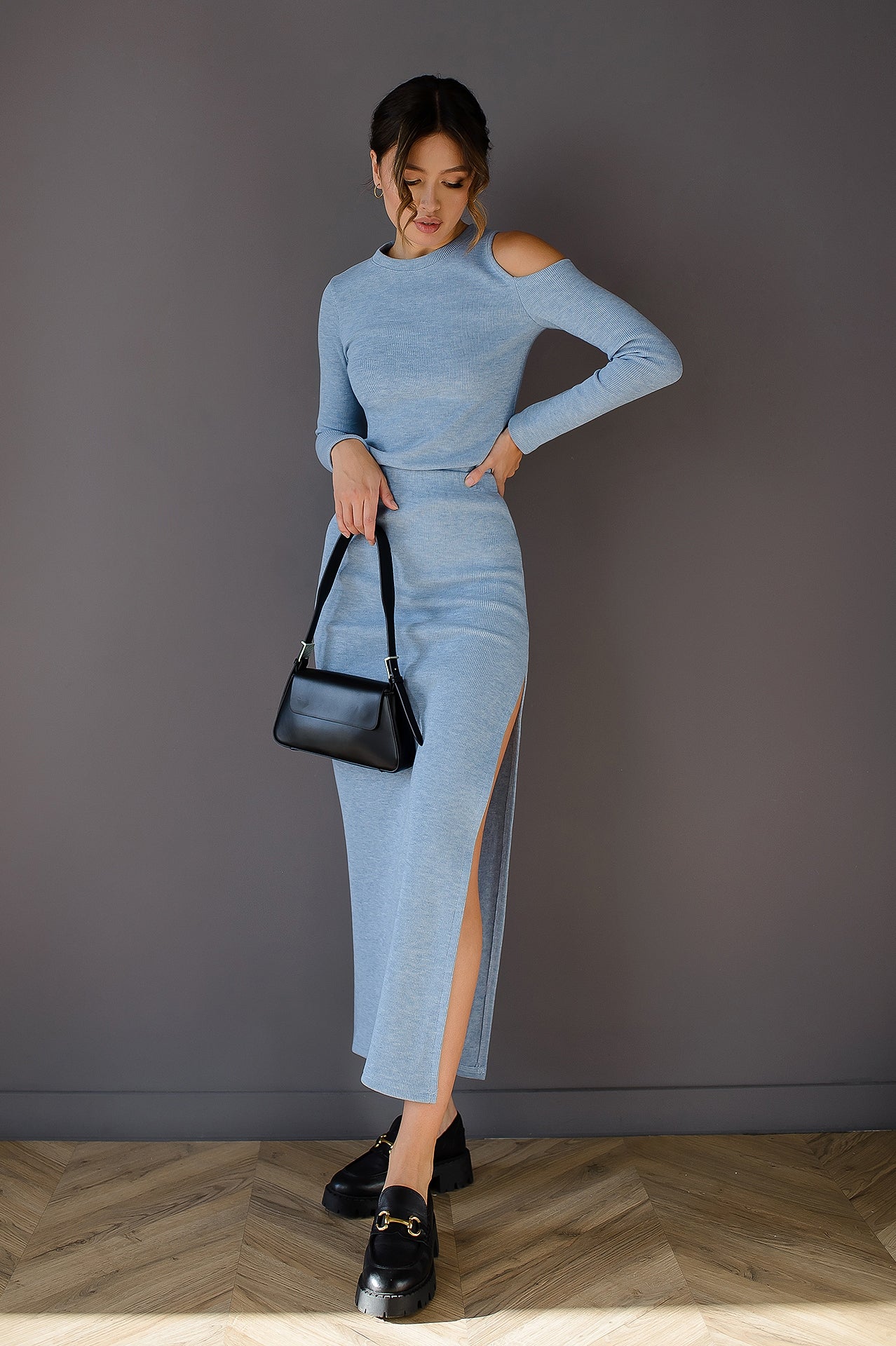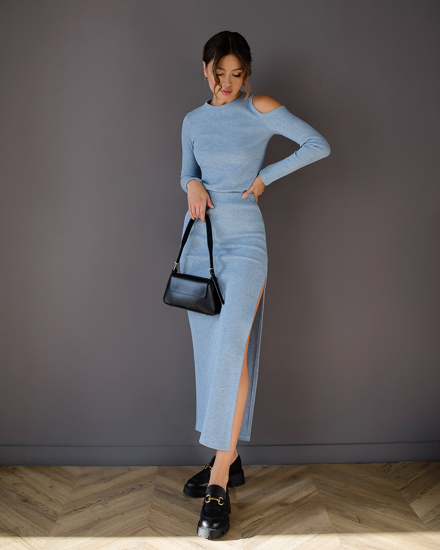 Sky-Blue Cut-Out Long Sleeve Midi Dress