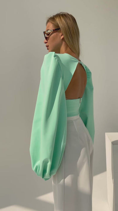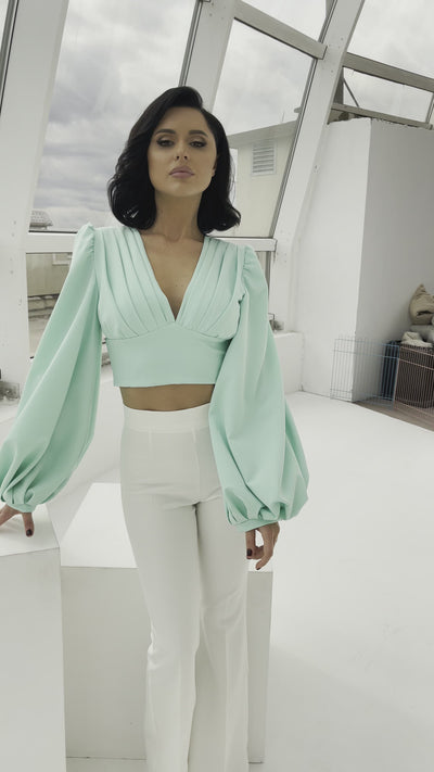 Mint Puff Sleeve V-neck Blouse