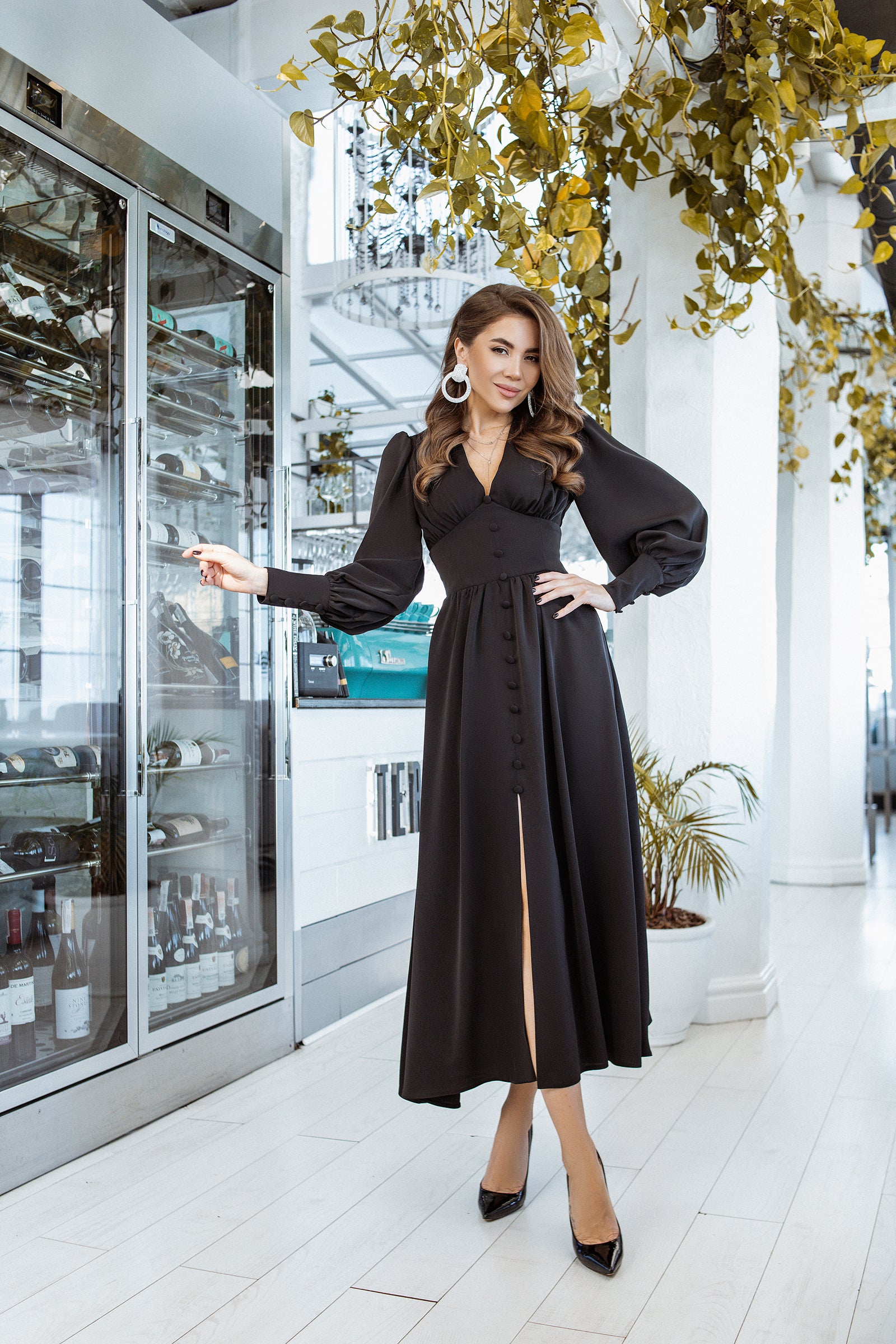 Black V-neck Buttoned Puff-Sleeve Midi Dress