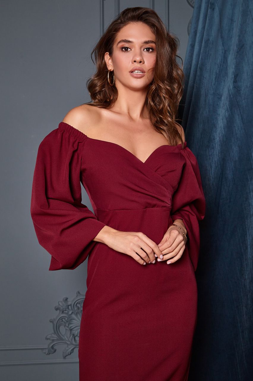 Bordeaux Puff-Sleeve Midi Dress