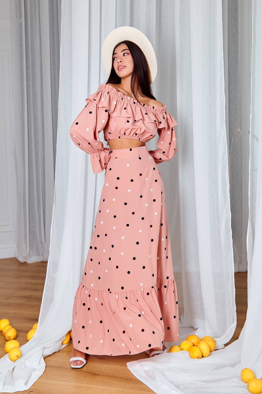 Dusty Pink Polka Dot Top & Maxi Skirt 2-Piece Set