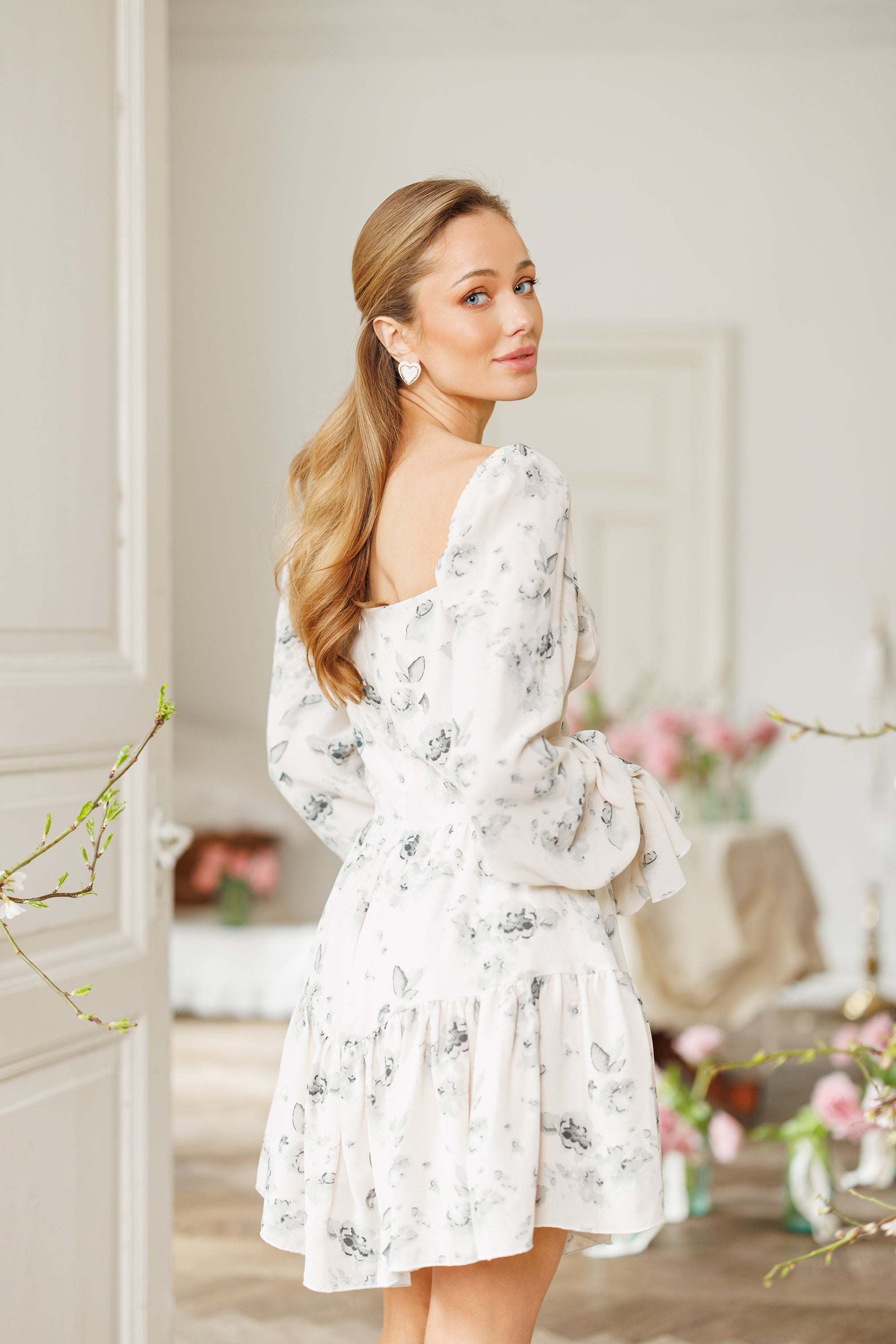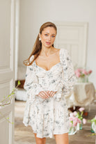 Grey Floral-Print Sweetheart Puff Sleeve Mini Dress
