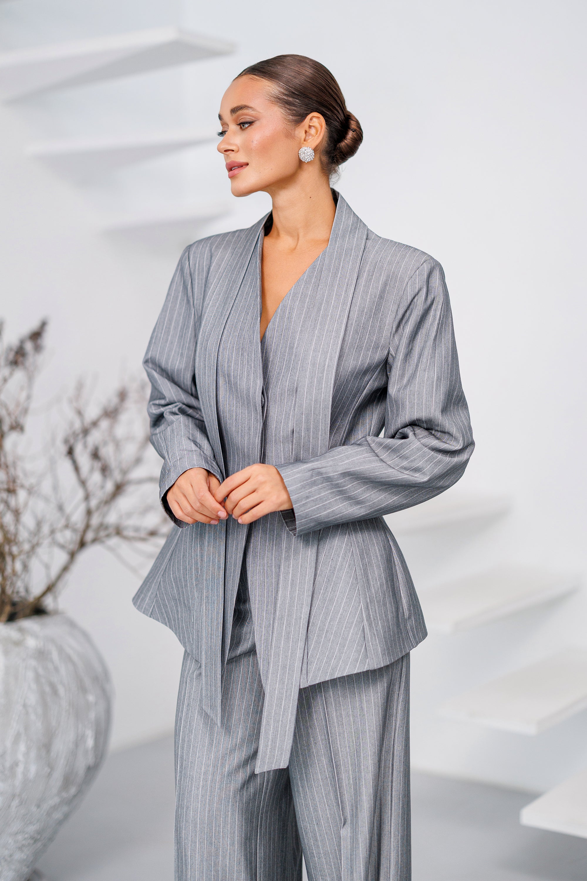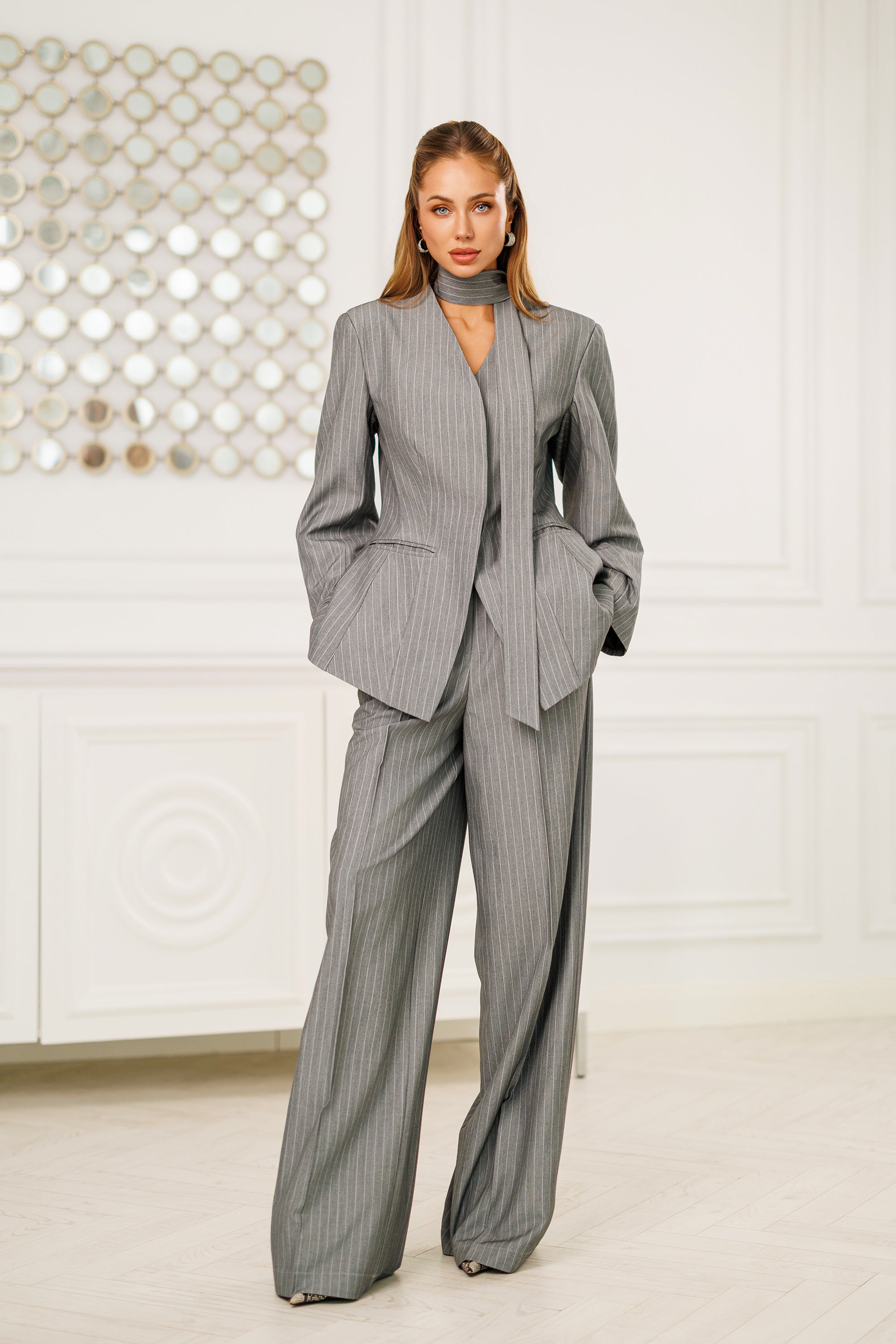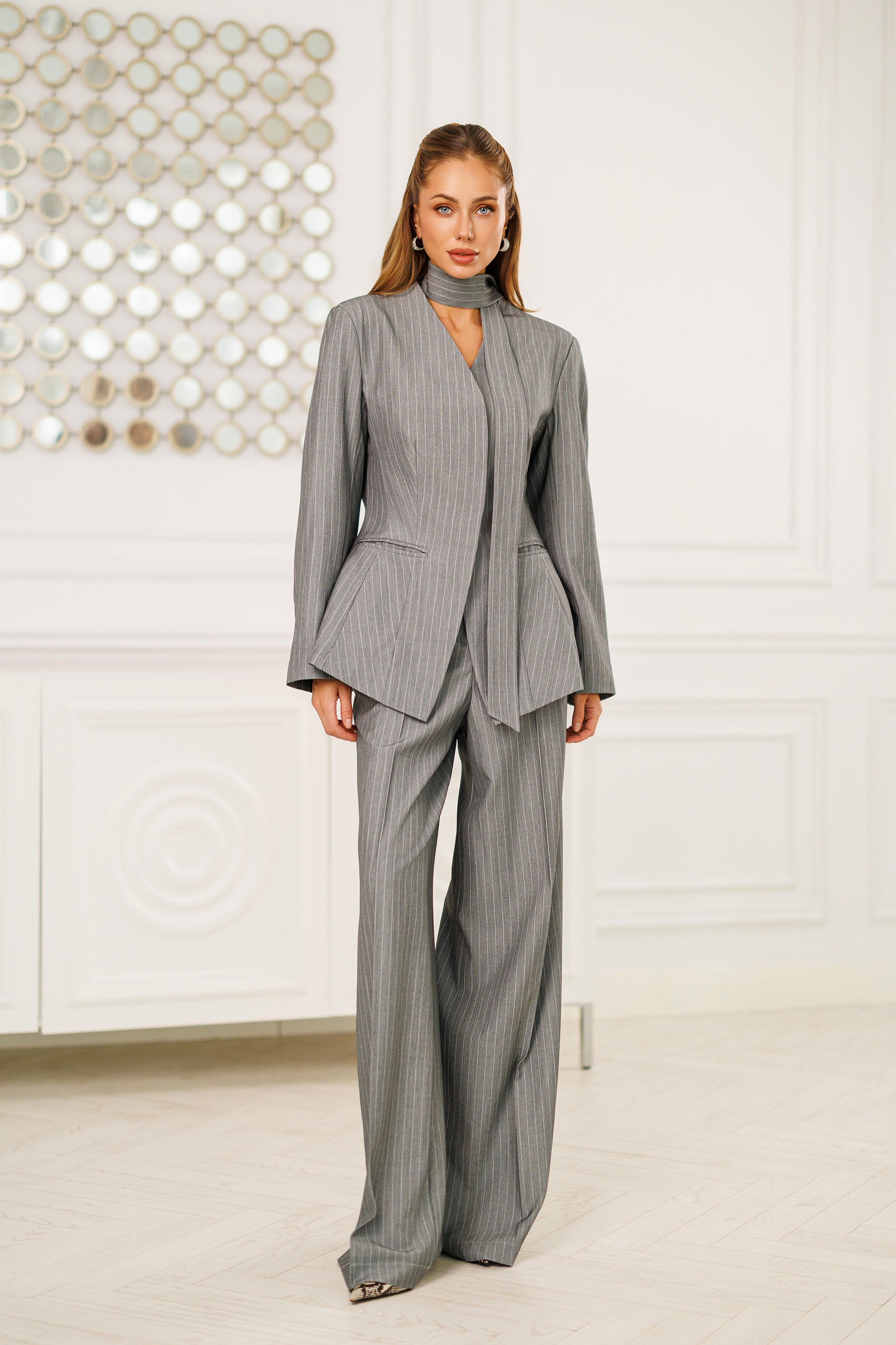 Grey Striped Scarf-Neck Single-Breasted Suit 2-Piece