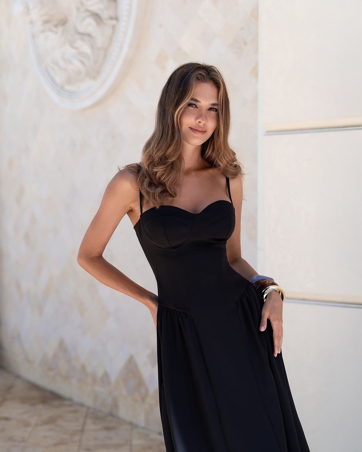 Monica Black Strappy Sweetheart Neckline Midi Dress