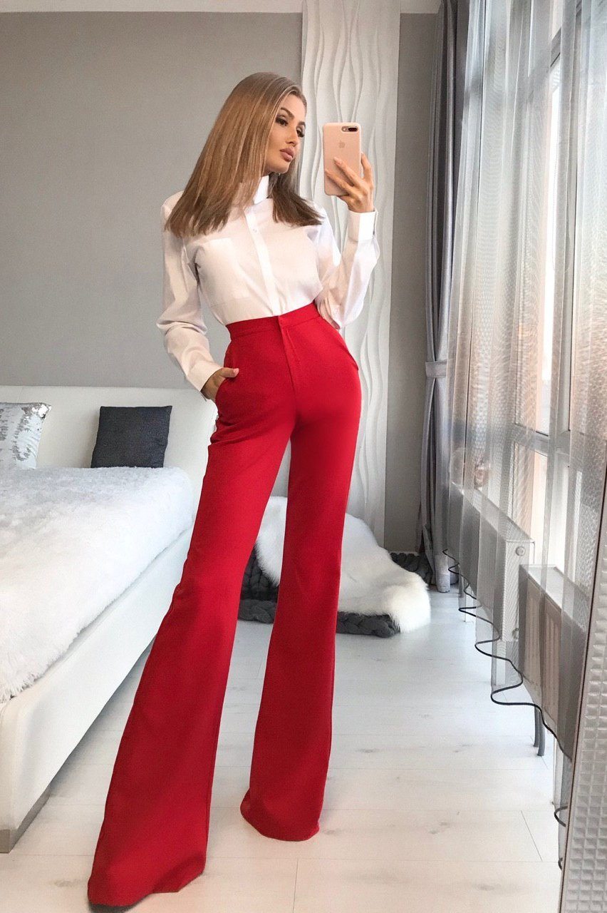Red High Waist Fitted Flared Pants