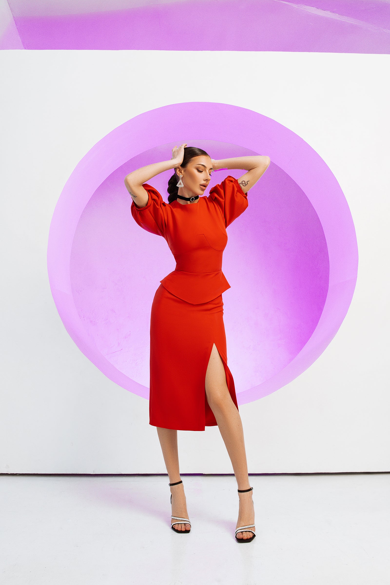 Red Puff-Sleeve Top & Midi Skirt 2-Piece Set